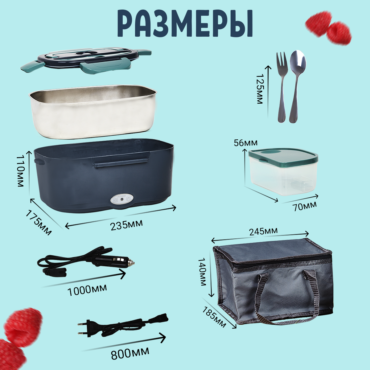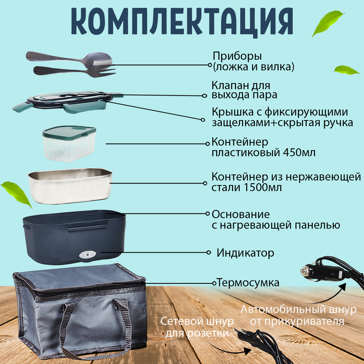 | Комплектация | Ланч-бокс - 1 шт., Контейнер из нержавеющей стали 1500мл - 1 шт., Контейнер пластиковый 450мл - 1 шт., Ложка - 1 шт., Вилка - 1 шт., Сетевой шнур для розетки - 1 шт., Автомобильный шнур от прикуривателя - 1 шт., Термосумка - 1 шт. |