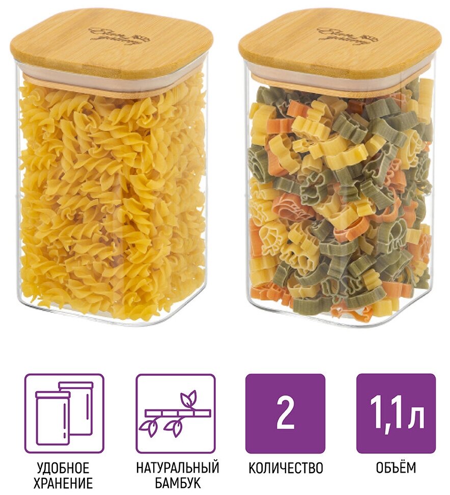 Набор 2 банок для хранения 1,1 л 10*10*15,5 см "Crystal glass"+ бамбук.крышк с силикон.проклад, стекло 1 395 ₽