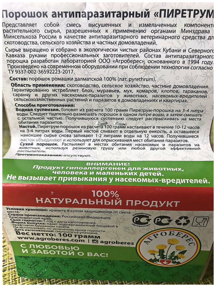 | Состав | Пиретрум-порошок далматской ромашки 100% |