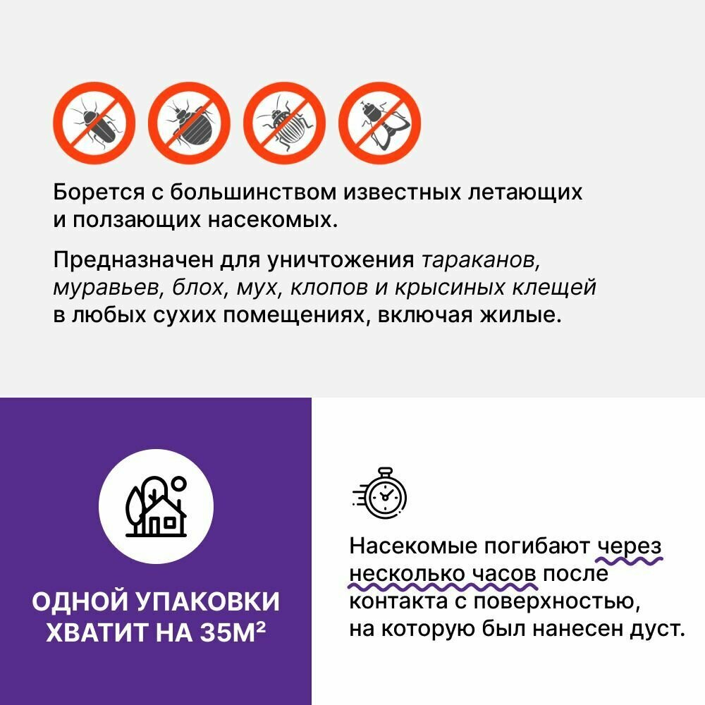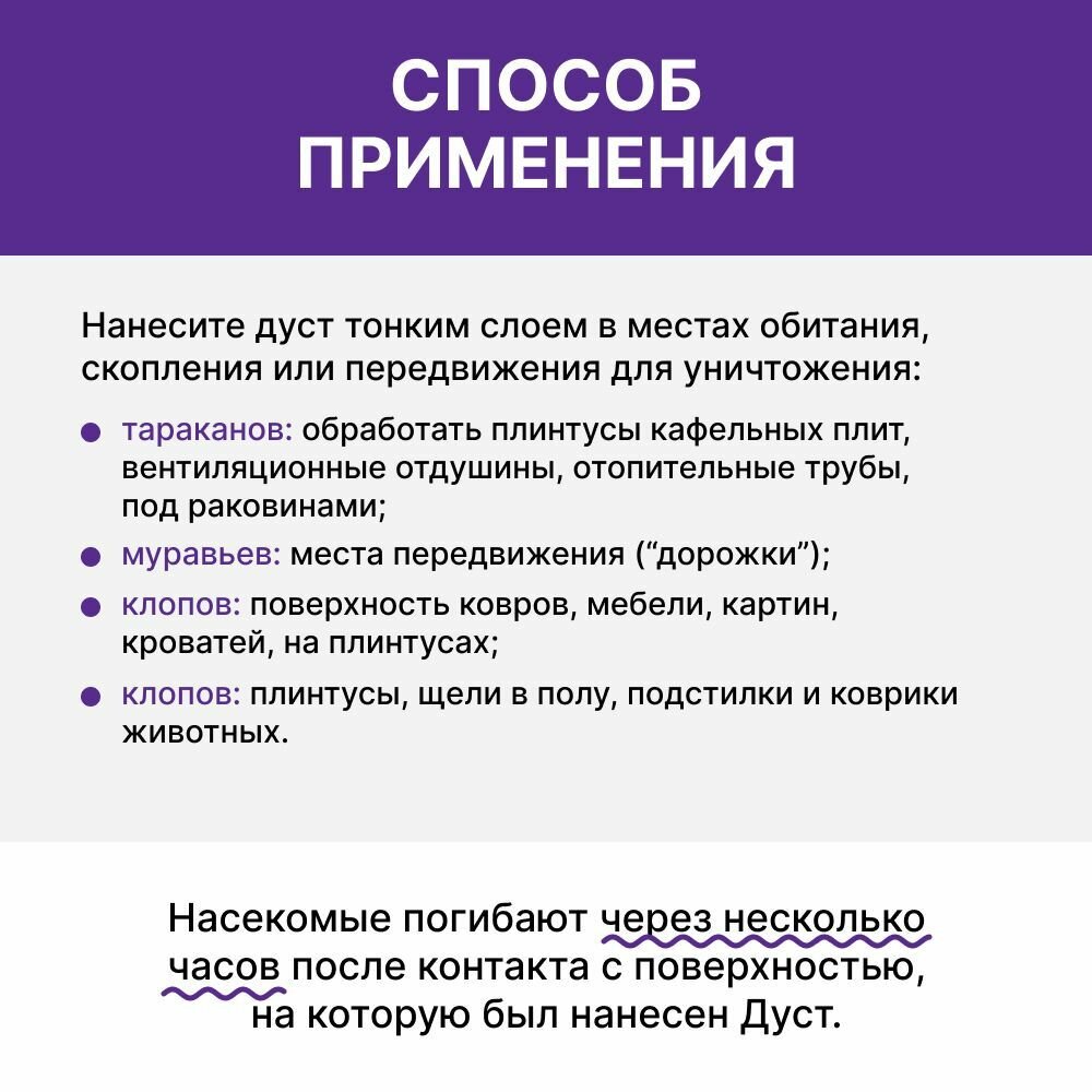 | Дополнительная информация | Обработку дома стоит проводить в перчатках, в отсутствии детей и домашних животных, в проветриваемом помещении. В отличие от клеевых ловушек или отпугивателей, дуст действует быстро - насекомые погибают через несколько часов после контакта с поверхностью, на которую он был нанесен |