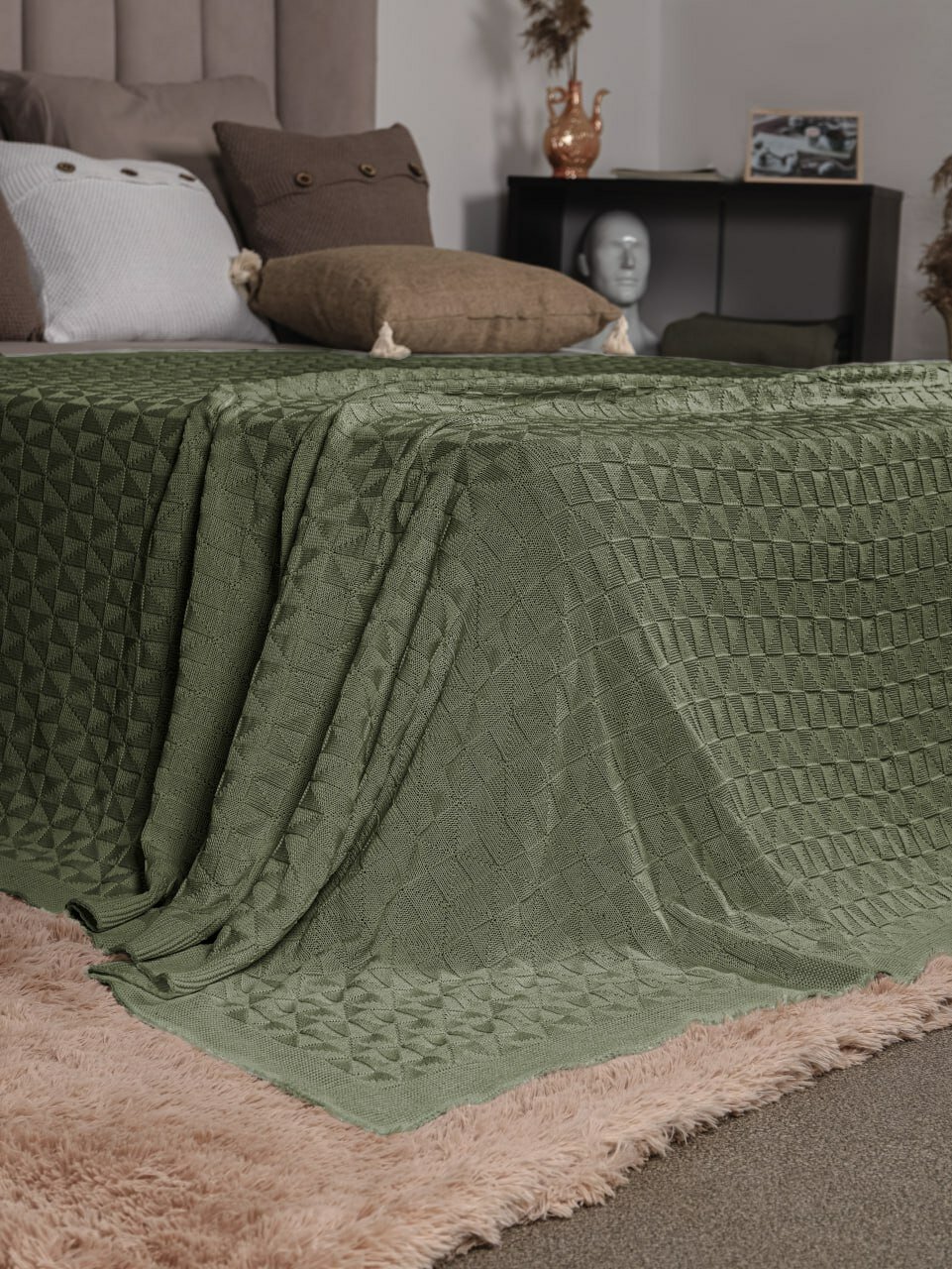Плед 220х240, вязаный, покрывало на кровать, на диван, оливковый, KING PLAID, Хлопок 100%, в подарочной сумке 4 000 ₽
