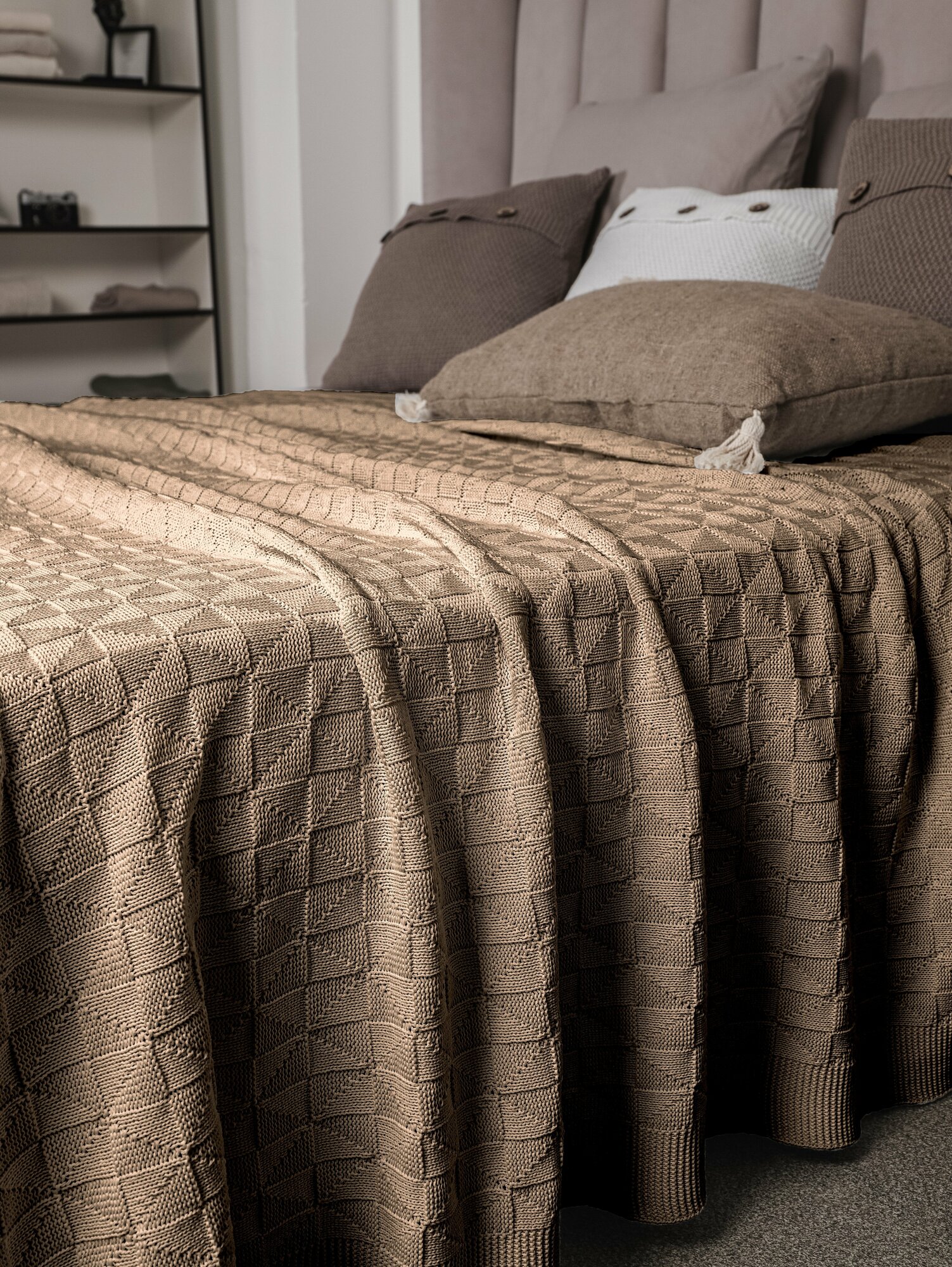 Плед 220х240, вязаный, покрывало на кровать, на диван, светло-бежевый, KING PLAID, Хлопок 100%, в подарочной сумке 4 000 ₽