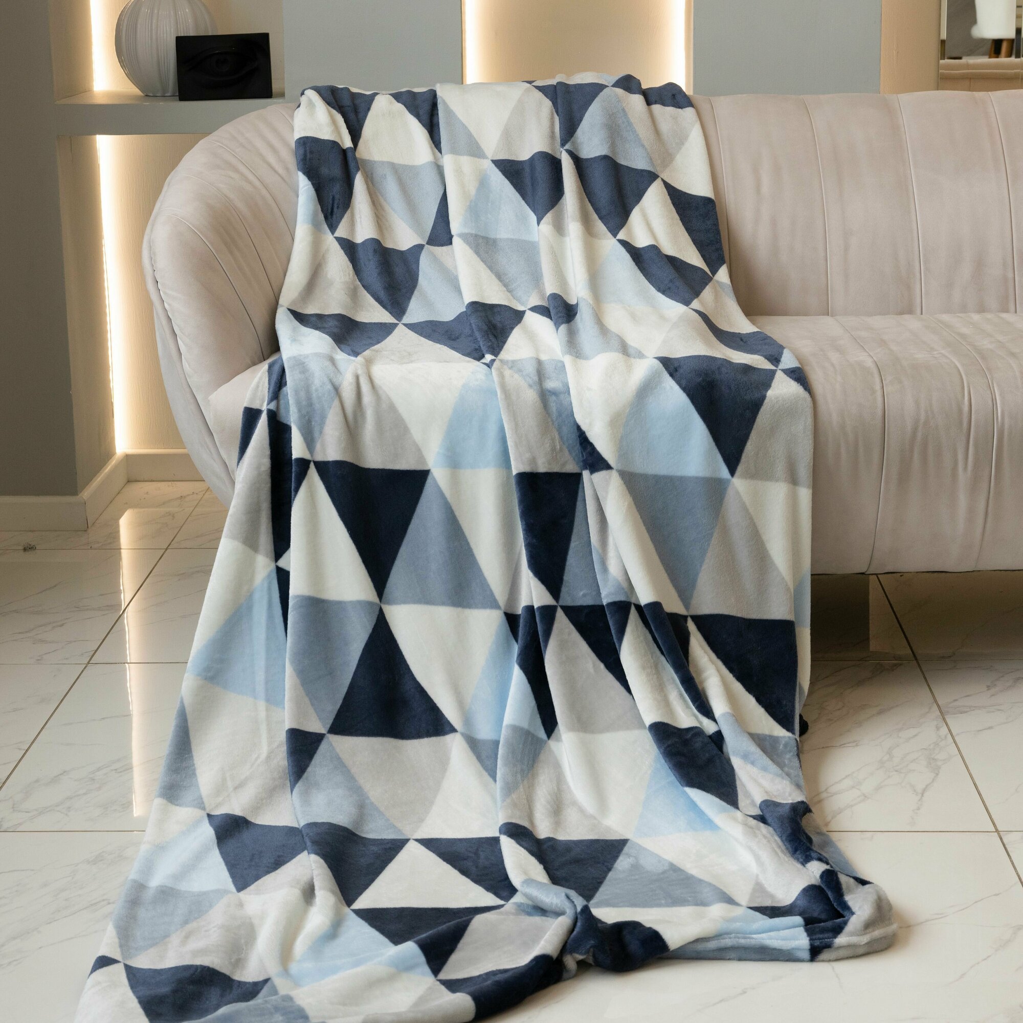 Мягкий плед на большую кровать, 220 х 240 см, серо-синий, геометрический рисунок