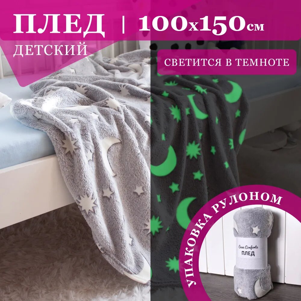 10 цен на Плед велсофт детский 100х150 см (светится в темноте) Стелла, луна / серый