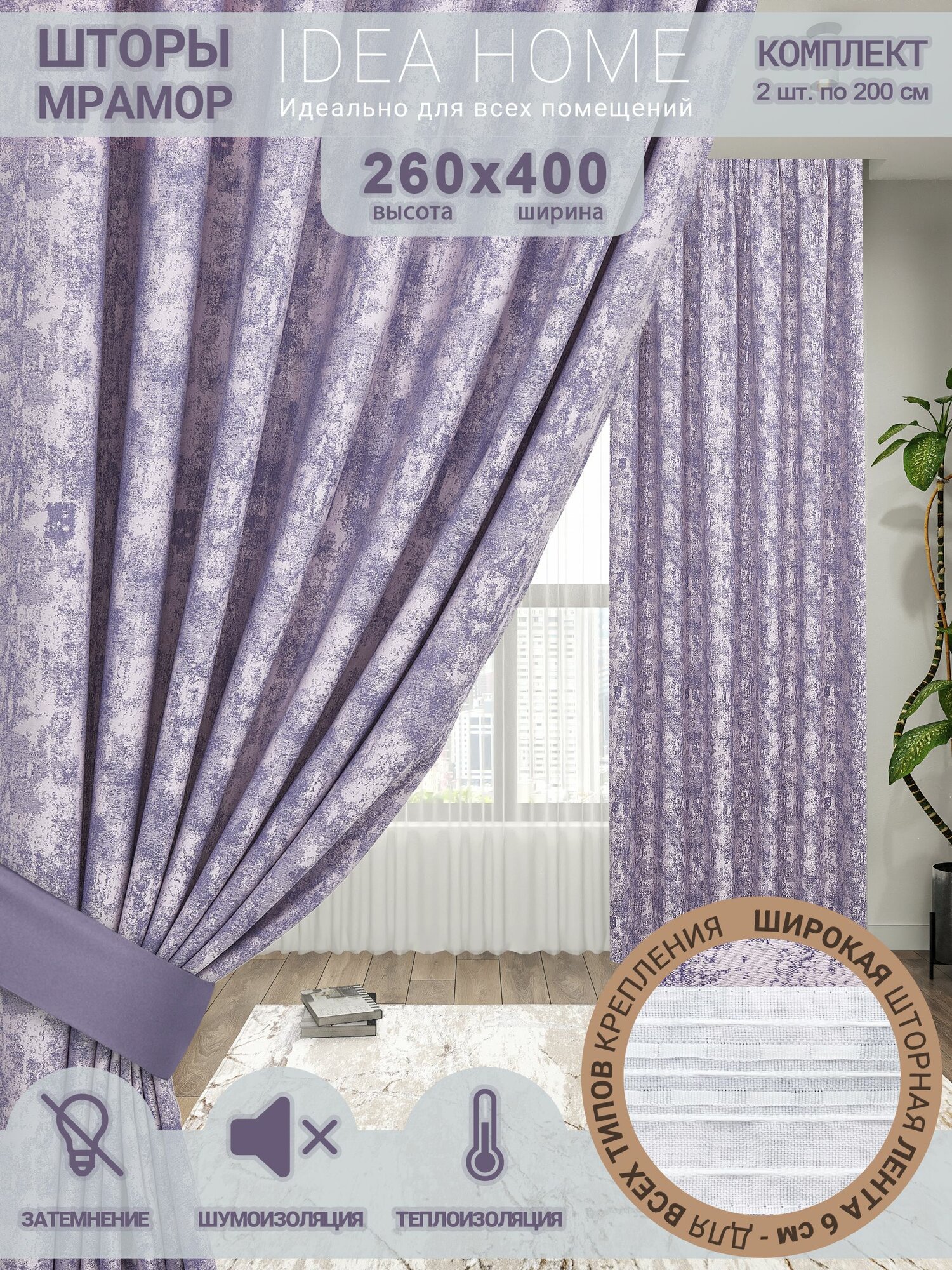 Комплект штор из 2 шт по 200 см / IDEA HOME светозащитные для комнаты , кухни , спальни , гостинной и дачи 400*260 см , однотонные , сиреневый мрамор информация:
