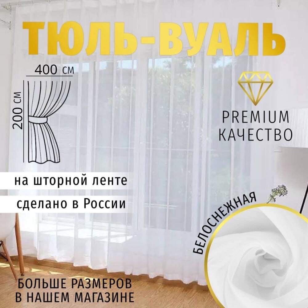 10 цен на Тюль Вуаль высота 200см Ширина 400см, 400х200, белая, для комнаты, кухни в гостиную, детскую, шторы