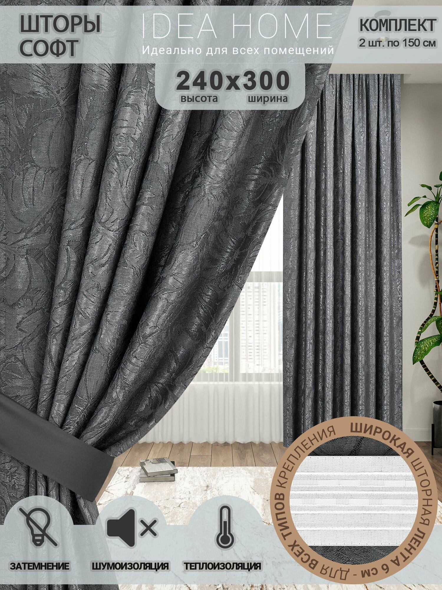 Комплект штор из 2 шт по 150 cм / IDEA HOME светозащитные для комнаты, кухни, спальни, гостиной и дачи 300*240 см , софт, темно-серый информация:
