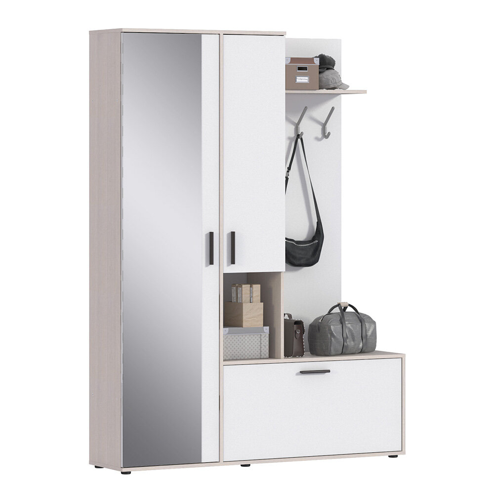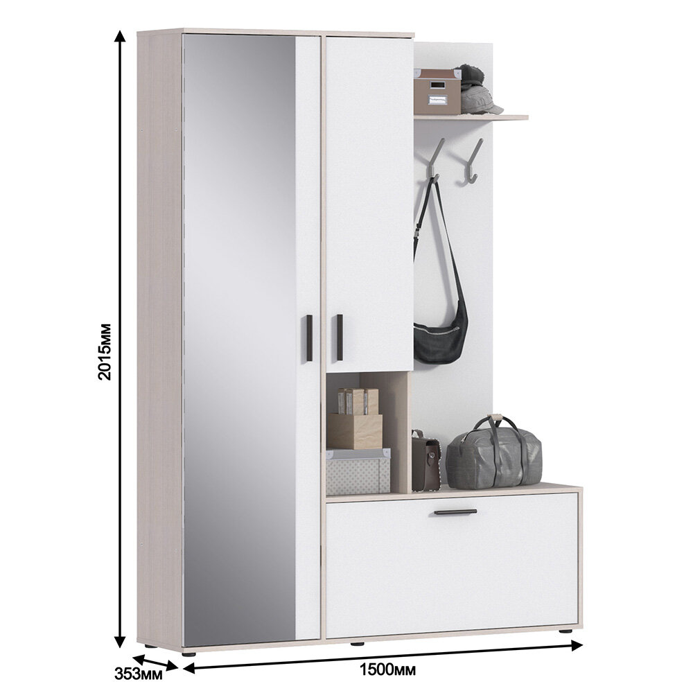 Прихожая комплект САША-6 (правая) от Фант-Мебель, с зеркалом, с обувницей, шкафом и ящиками, 156x203,6x43 см. Ясень темный/Ясень светлый