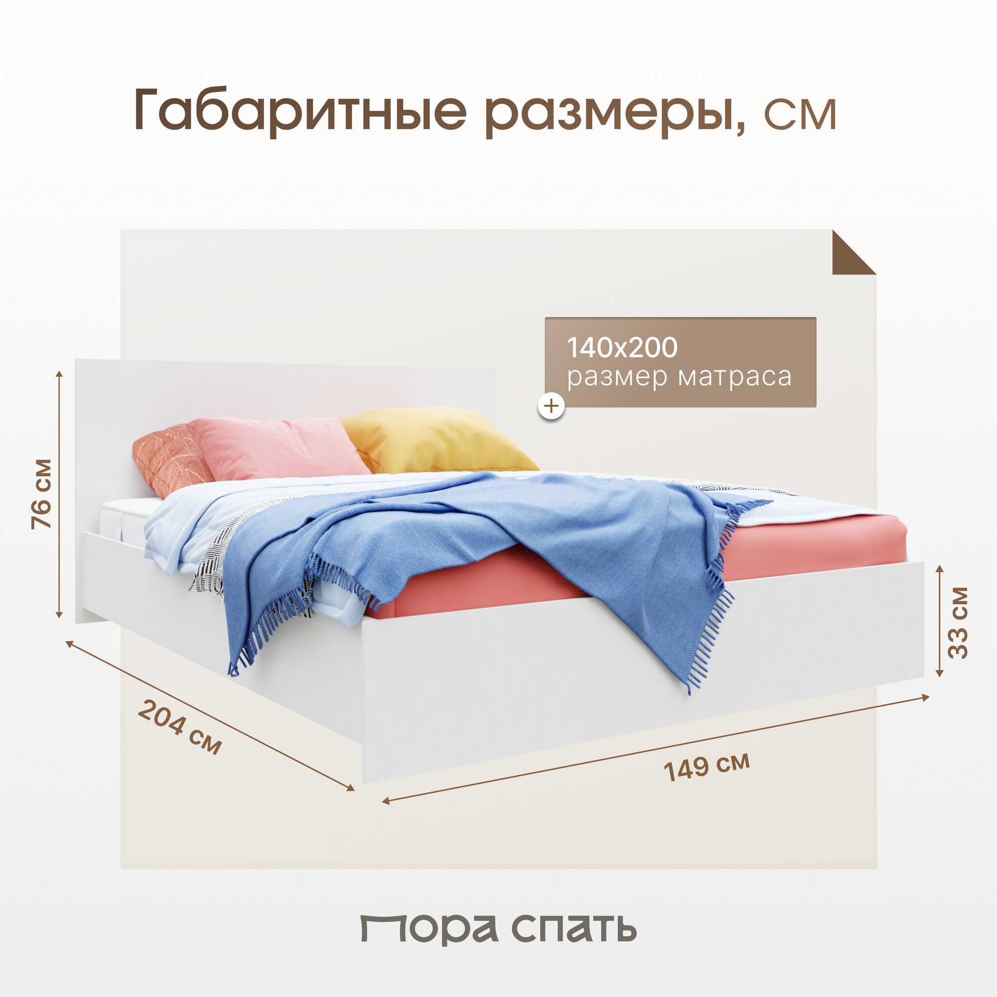 Кровать двуспальная Пора Спать Амелина с основанием ДСП, белая, спальное место: 200х140 см, габариты: 204х149 см информация: