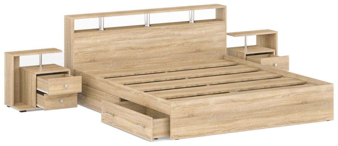 Кровать с ящиками 1800 с двумя тумбочками Камелия, цвет дуб сонома, ШхГхВ 296х217х78,2 см, спальное место 1800х2000 мм, без матраса, основание есть