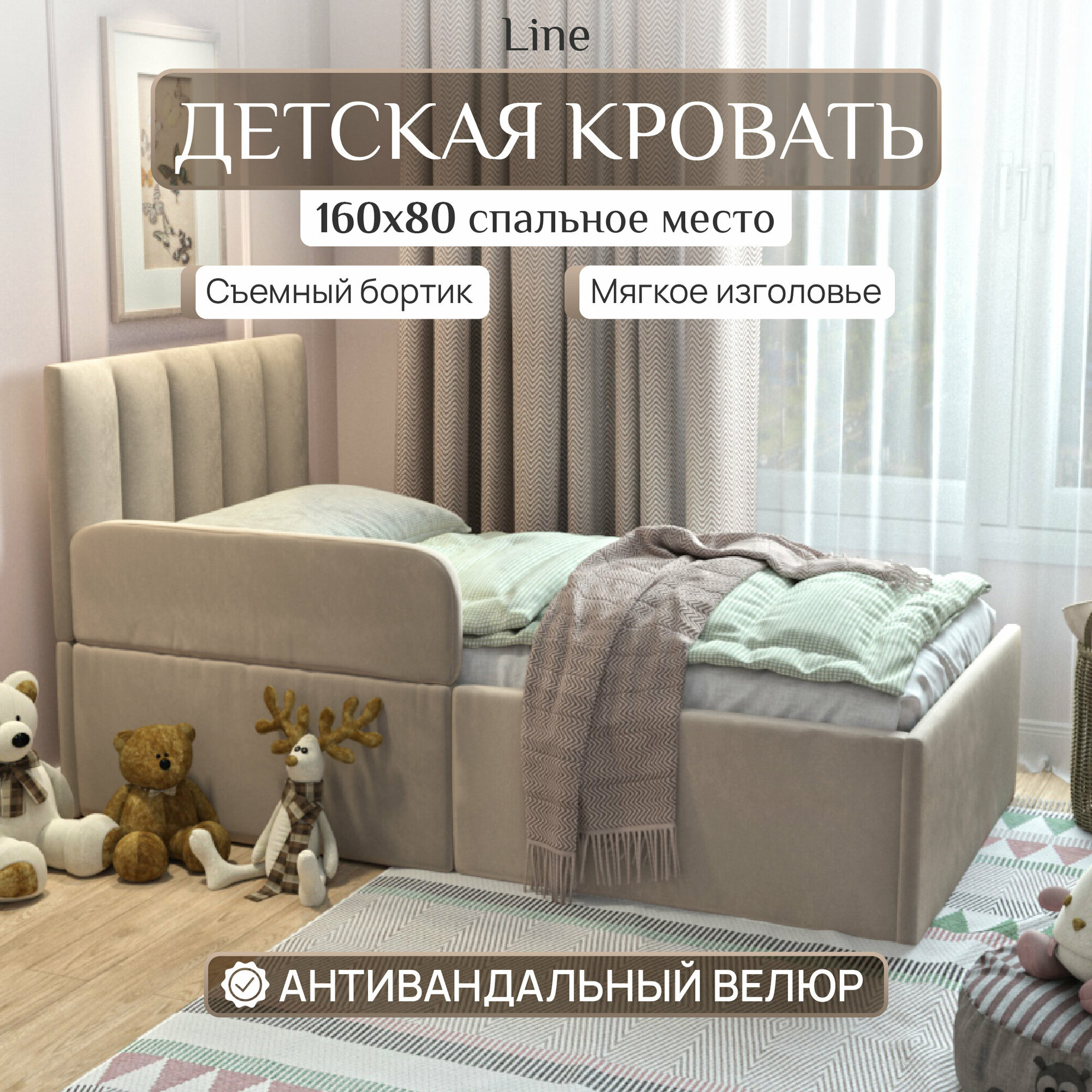 Детская кровать с бортиком 160x80 см, односпальная c мягким изголовьем для детей от 3-х лет, антивандальный велюр, цвет Бежевый информация: