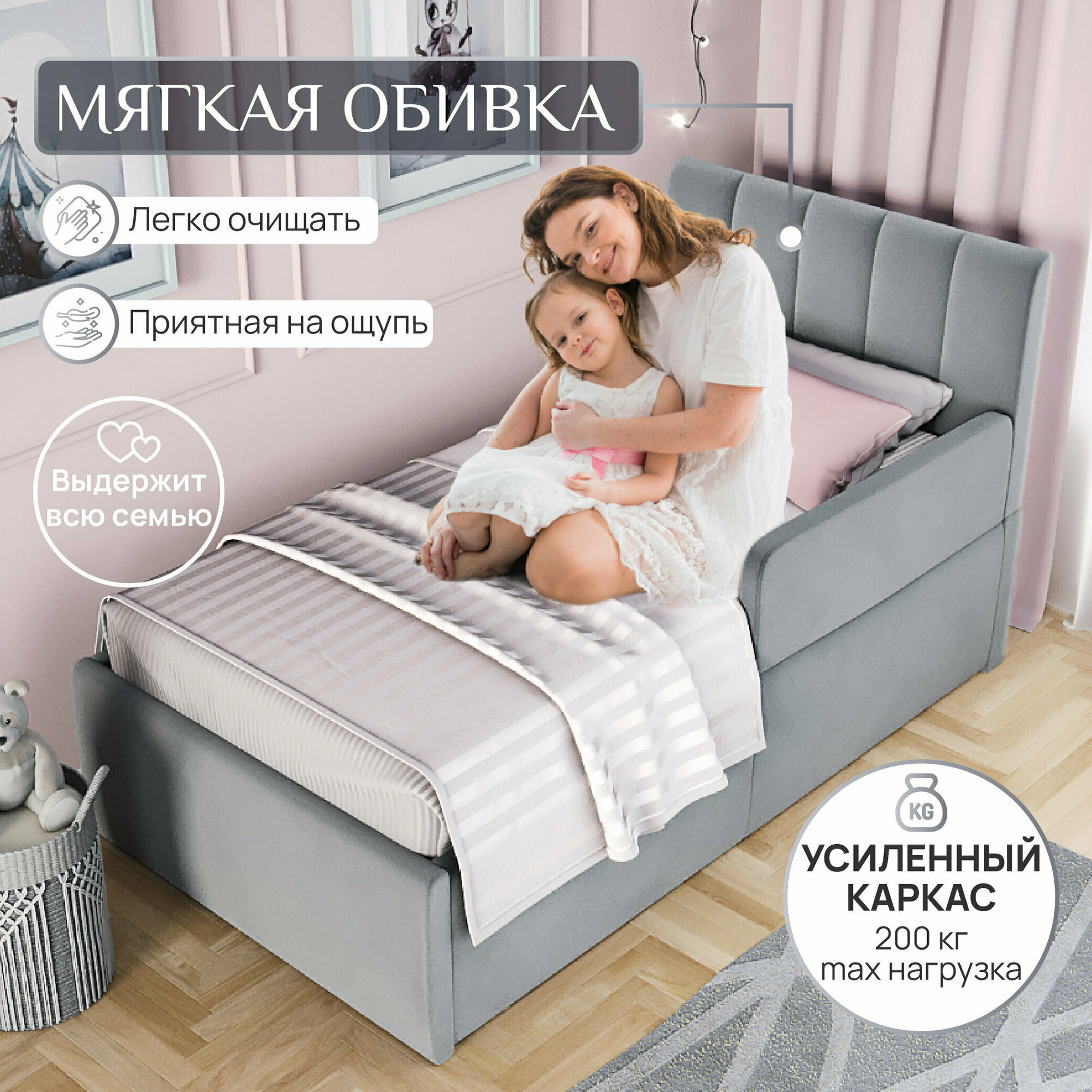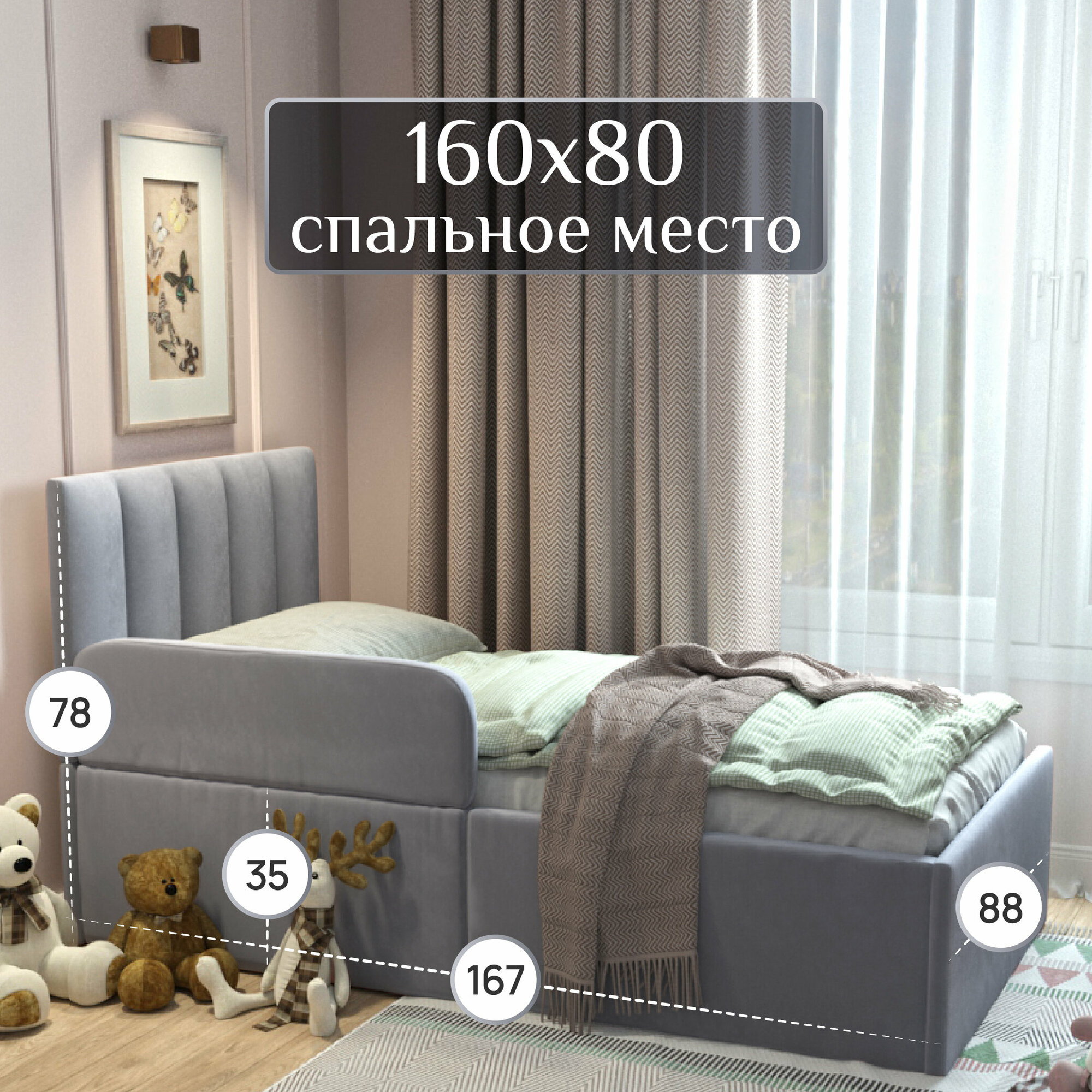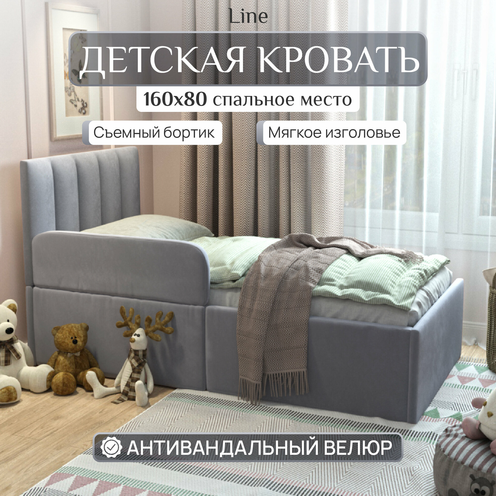 Отзывы на Детская кровать с бортиком 160x80 см, односпальная c мягким изголовьем для детей от 3-х лет, антивандальный велюр, цвет Серый