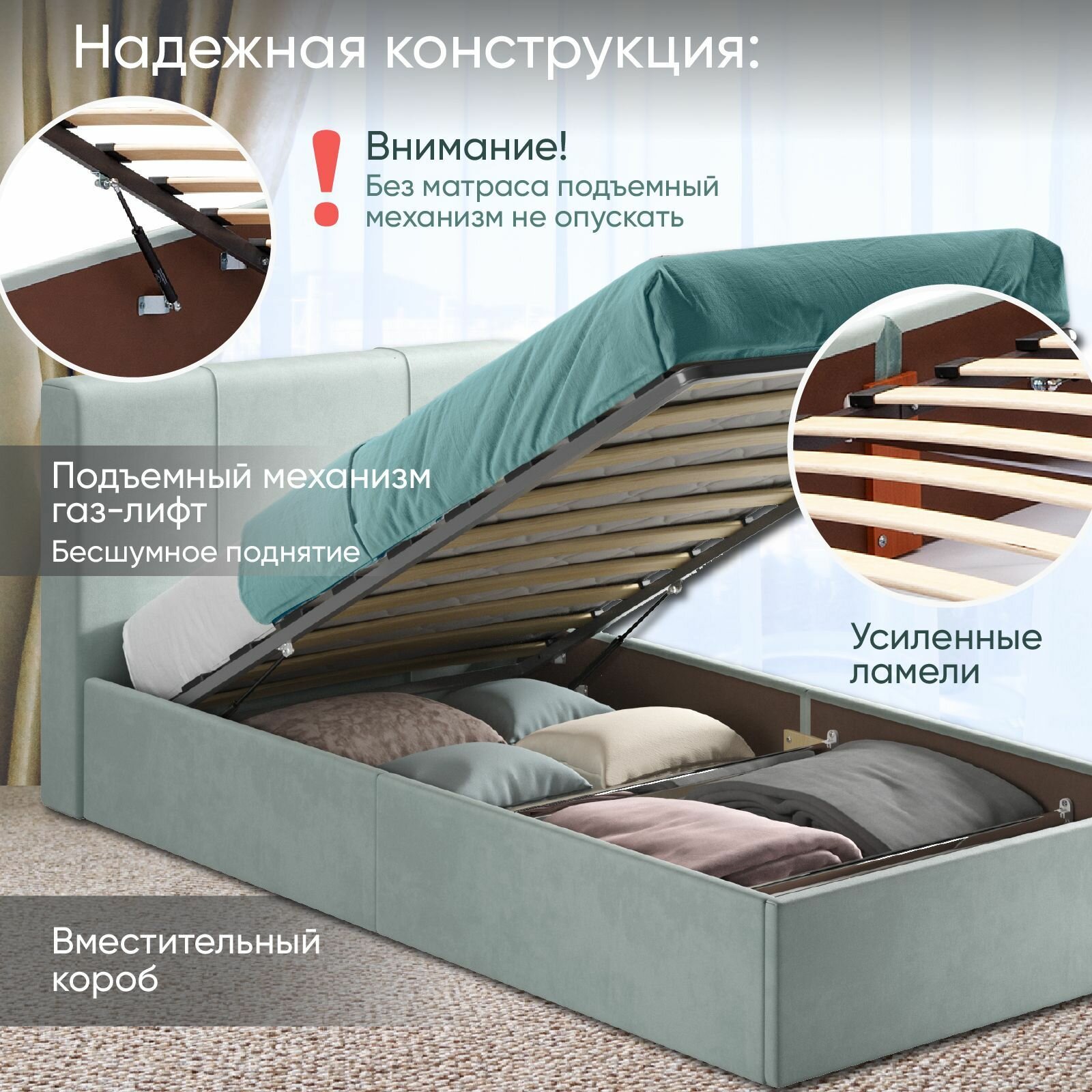 10 цен на Односпальная кровать детская 90х190 см, подростковая с подъемным механизмом, ортопедическое основание, ламели усиленные, мягкое изголовье, ящик для белья, вельвет мятный, Ами Мебель Беларусь