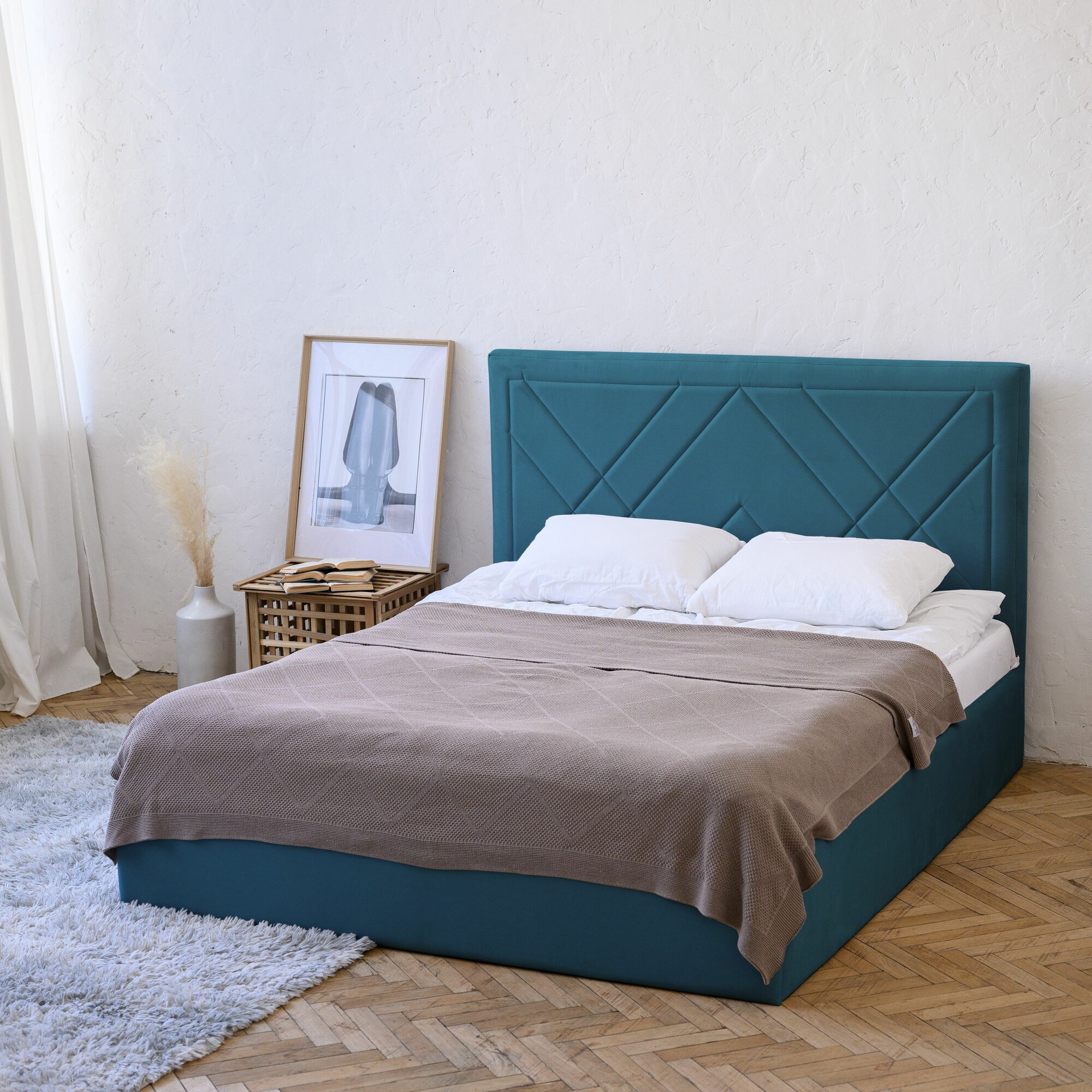 Кровать 140х200 двуспальная Алекса, с подъёмным механизмом, с ящиками, с мягким изголовьем, синяя 25 183 ₽