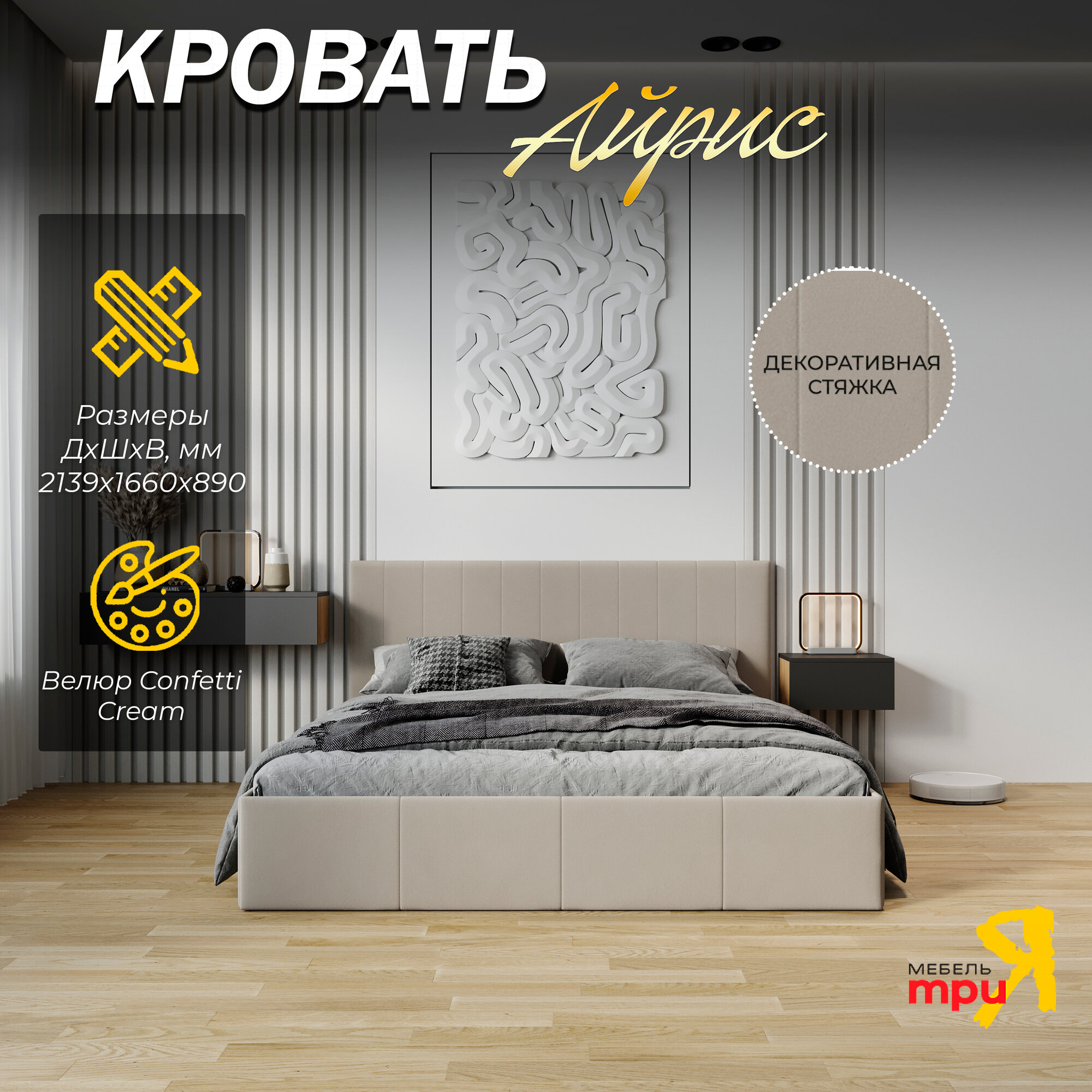 Кровать двуспальная ТриЯ 160х200 с подъемным механизмом, Айрис, Велюр Confetti Cream информация: