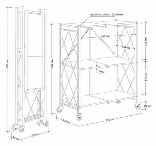 10 цен на Этажерка на колесиках металлическая (3 полки) / Складной металлический стеллаж, LettBrin 73 х 40 х 88.5 см, 3 яруса, черный