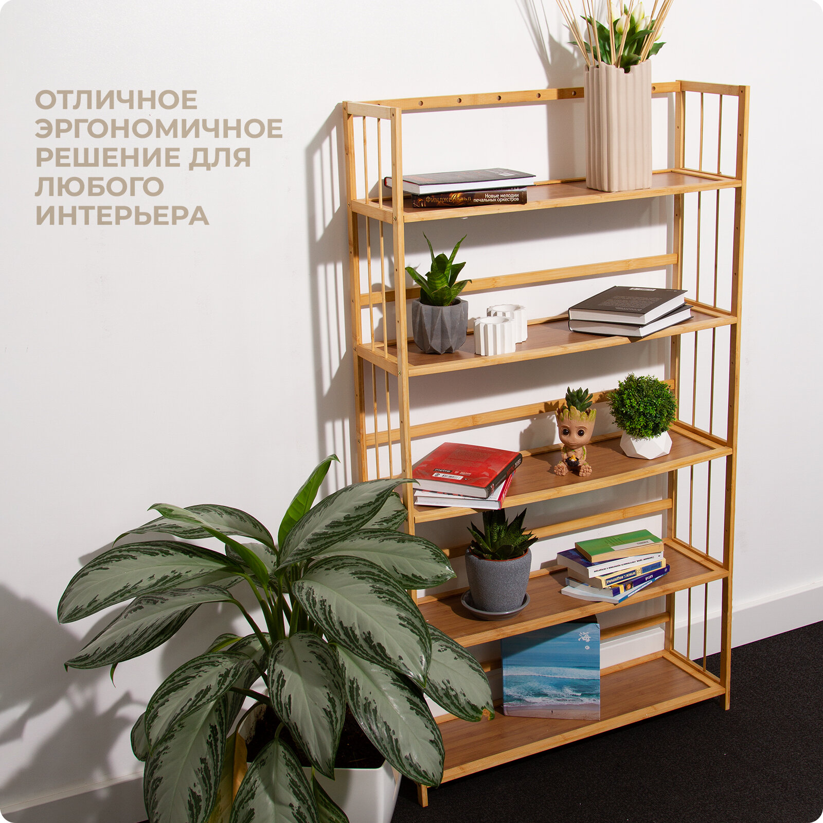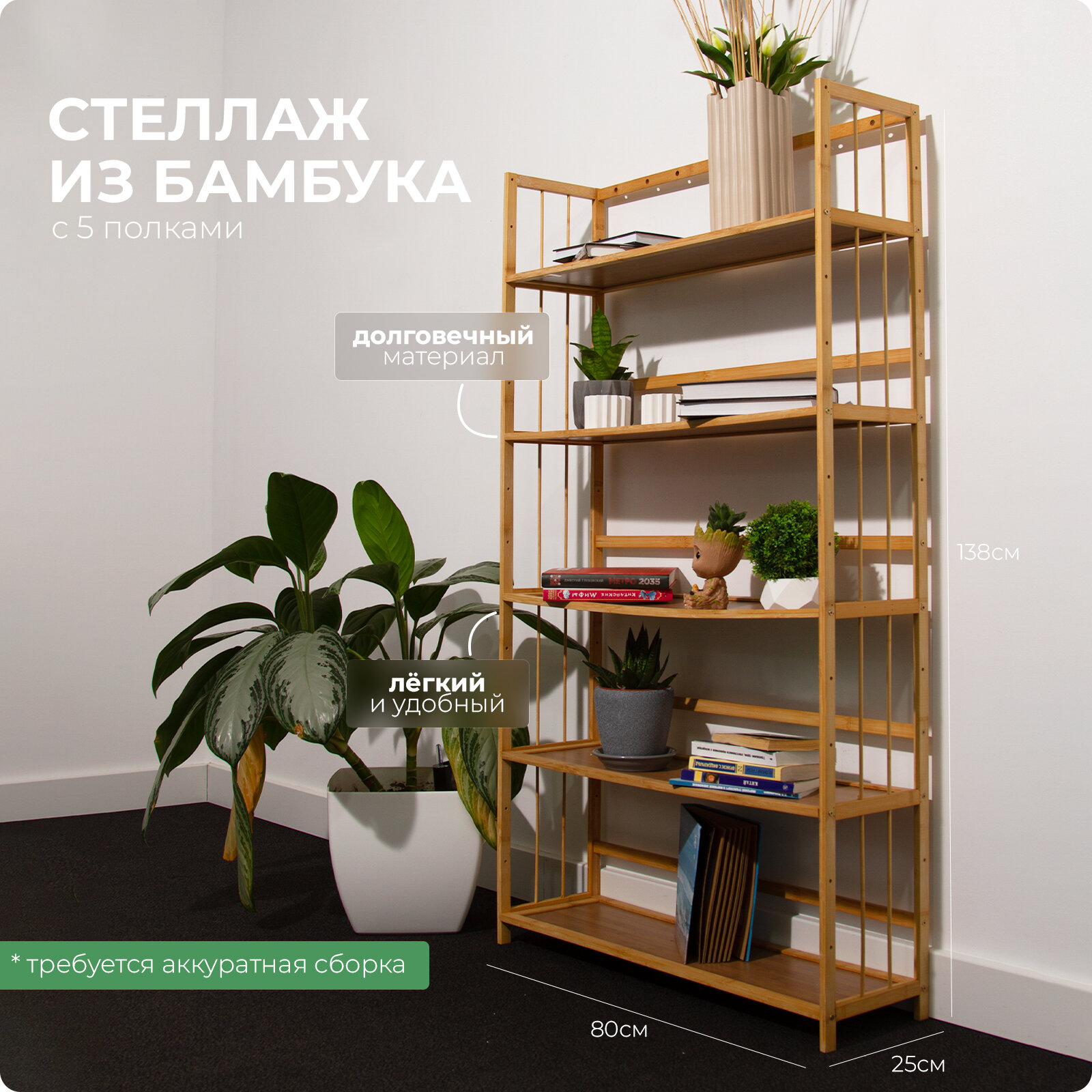 Отзывы на Стеллаж деревянный 5 полок, 138х80х25 см Hans&Helma из бамбука универсальная этажерка для игрушек, книг, дача
