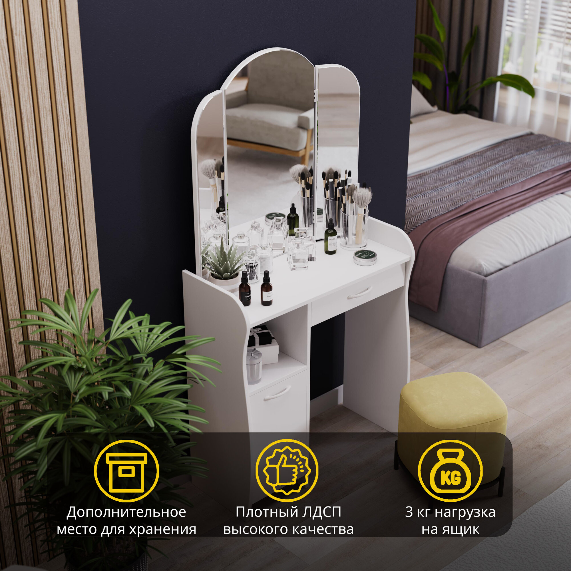Туалетный столик, трюмо, гримерный столик с ящиком и полками белый (ВхДхГ) 152х79х33, София Т1 информация: