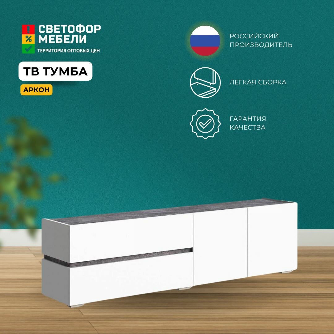 Тумба ТВ Аркон, белый/бетон темный ЛДСП, для гостиной, дома, дачи 1800х 490х 370, хандис информация: