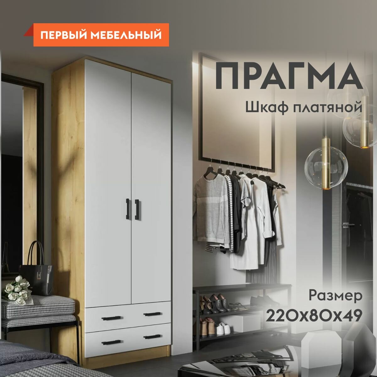 Первый Мебельный Распашной шкаф для одежды Прагма с ящиками, с полками, продольная штанга, 80х48.7х220 см, Дуб Вотан / Белый гладкий