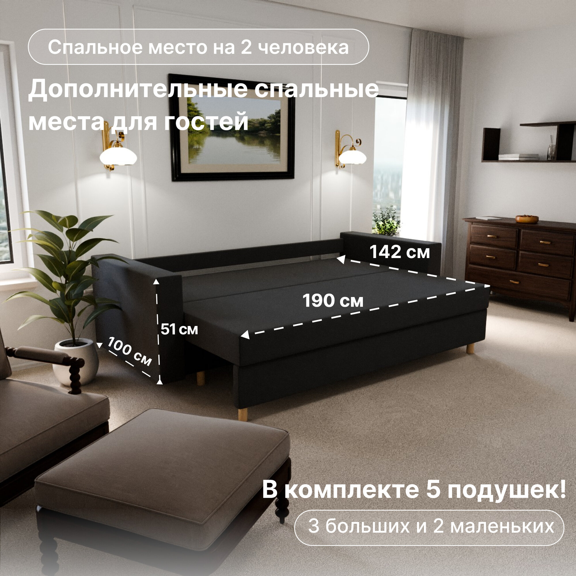 | Особенности | раскладная конструкция, с подлокотниками, съемные подушки, съемный чехол, ящик для белья |