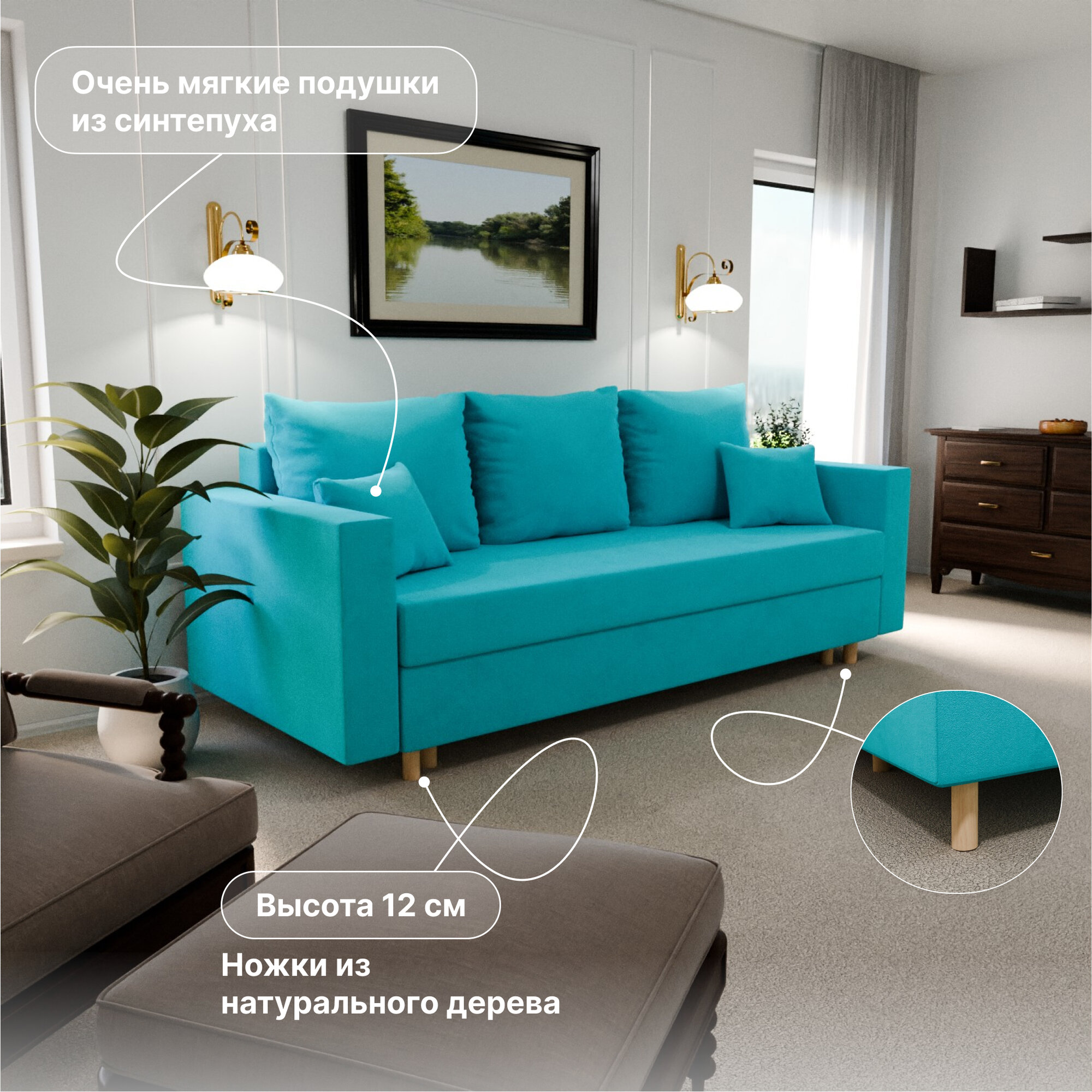 | Особенности | раскладная конструкция, с подлокотниками, съемные подушки, съемный чехол, ящик для белья |