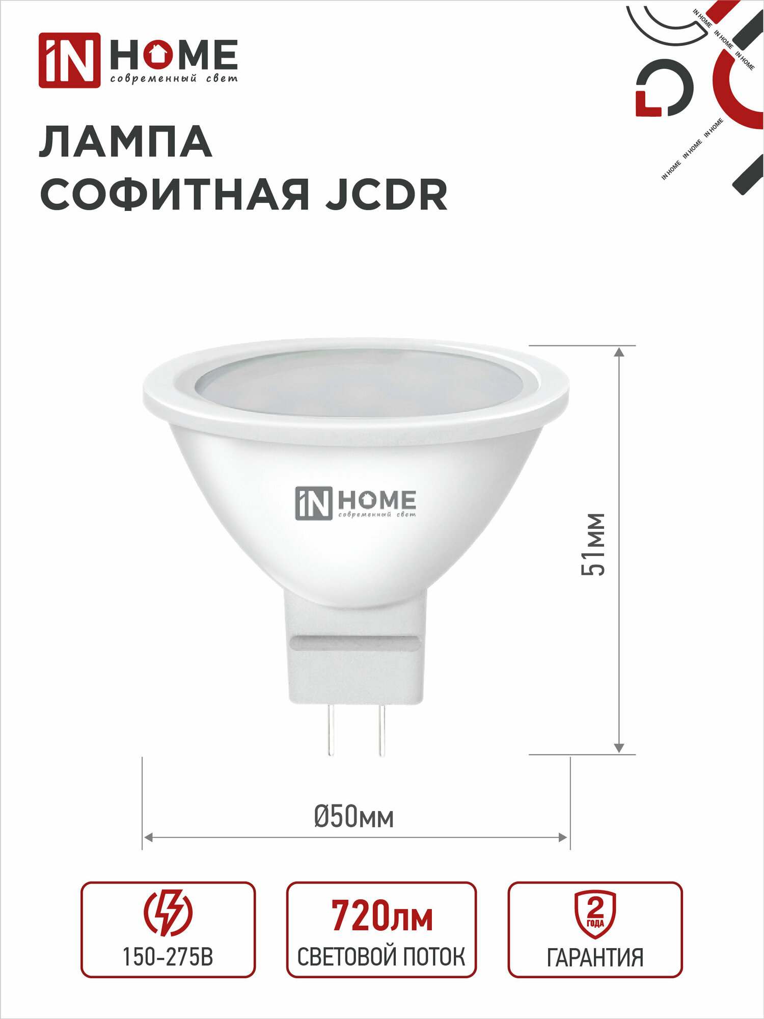 Комплект 4 шт. лампа светодиодная LED-JCDR-VC 4PACK 8Вт 230В GU5.3 6500К 720Лм IN HOME 4690612047935 информация: