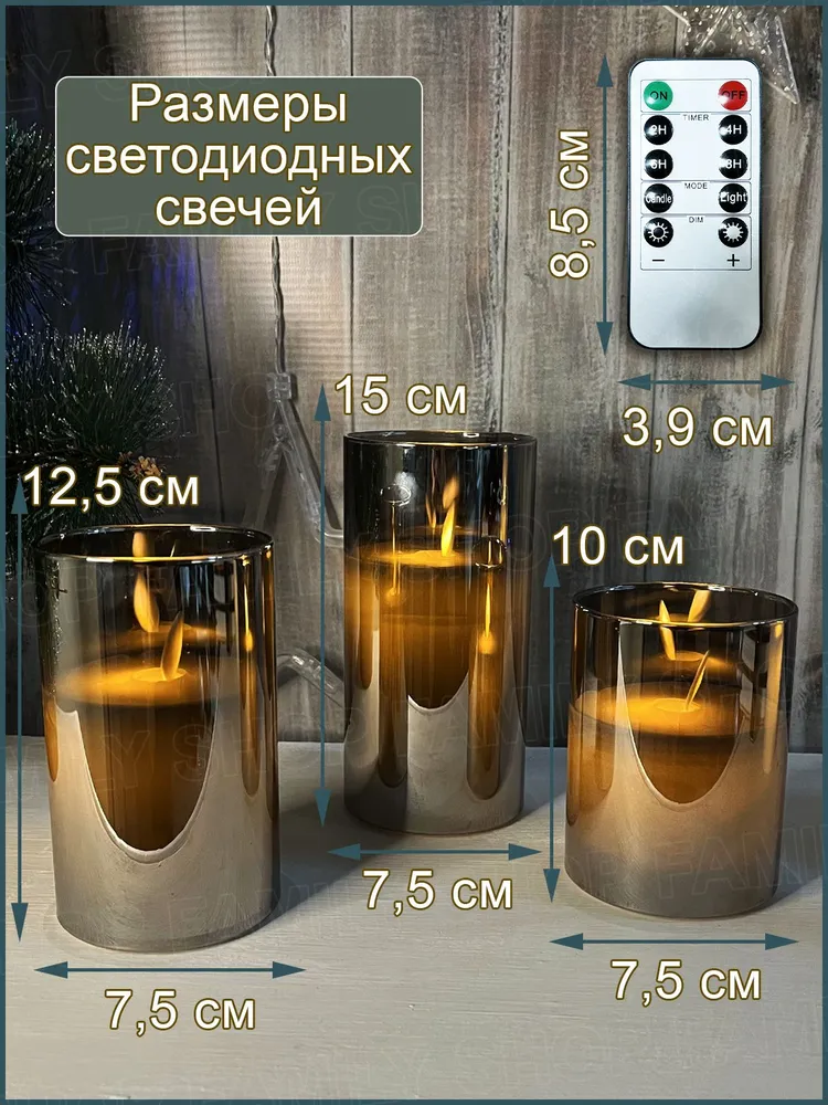 | Комплектация | Свеча 7,5 x 10 см, Свеча 7,5 x 12 см, Свеча 7,5 x 15 см, Пульт управления |