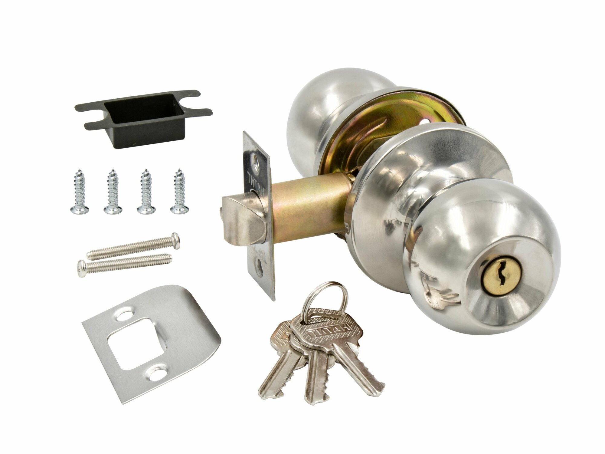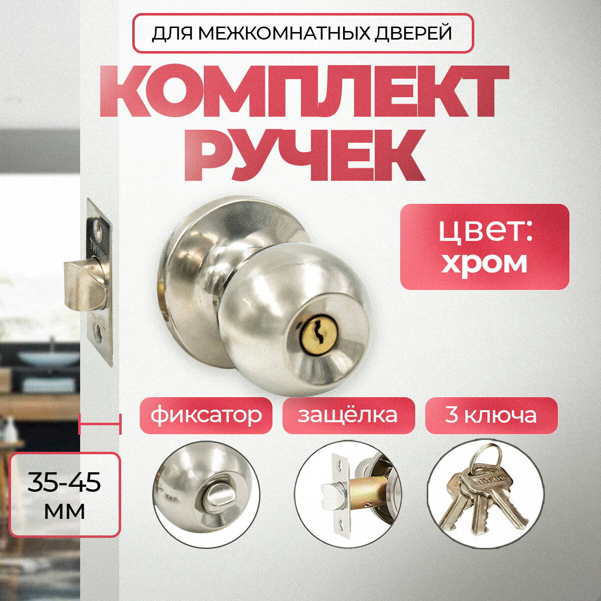 Ручка дверная межкомнатная хром блестящий с защелкой, заверткой и ключами комплект