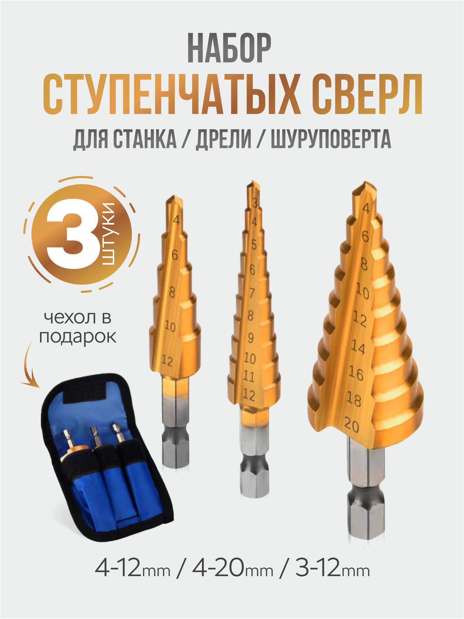 Набор ступенчатых сверл по металлу 4-32 мм с титановым покрытием в чехле набор 3 шт (4-12мм, 4-20мм, 4-32мм)