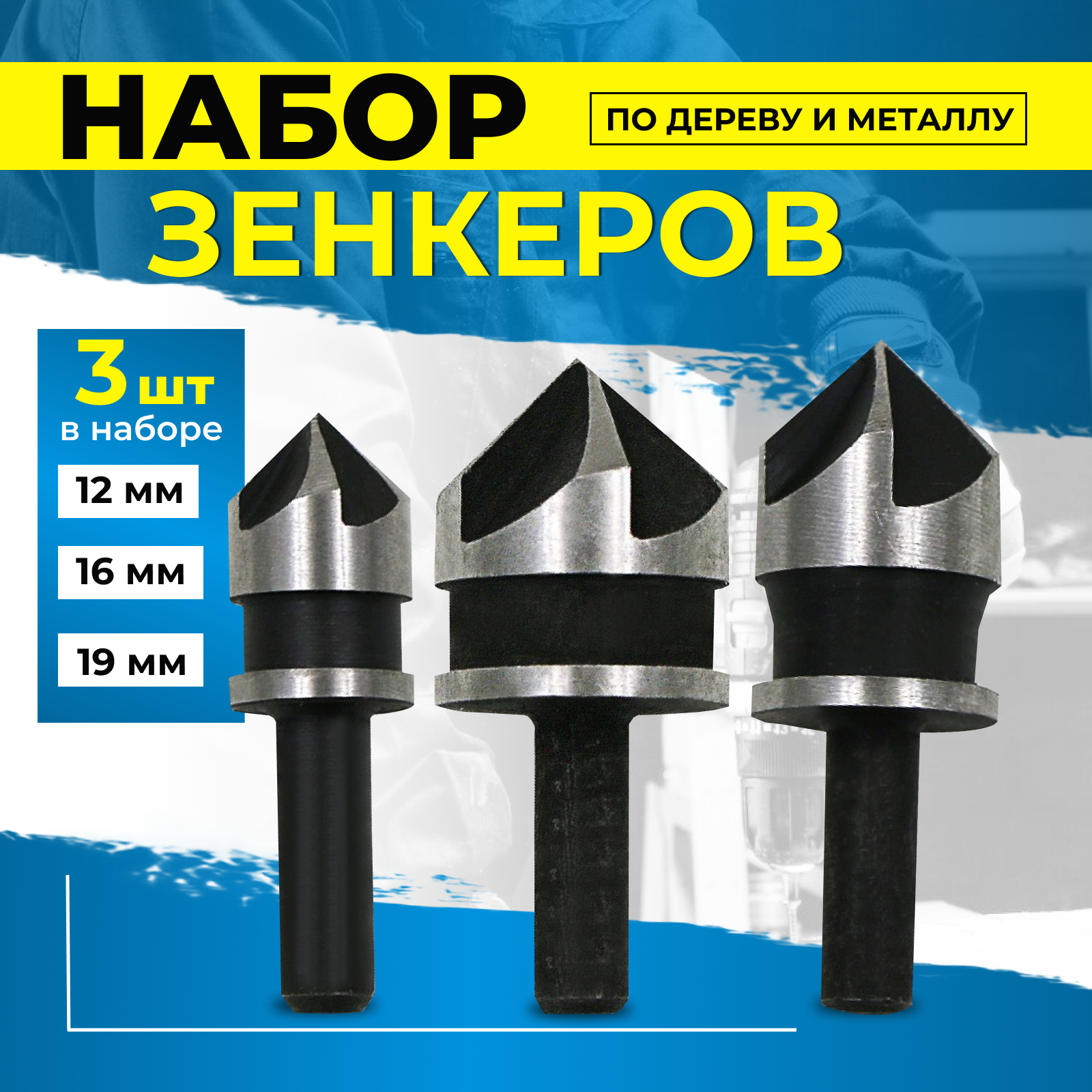 10 цен на Сверло по дереву, зенкер для снятия фаски канавки под саморезы, насадка набор из 3х шт. 12, 16, 19 мм, фреза зенковка