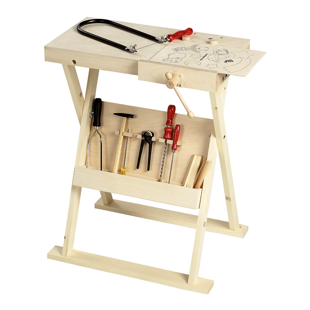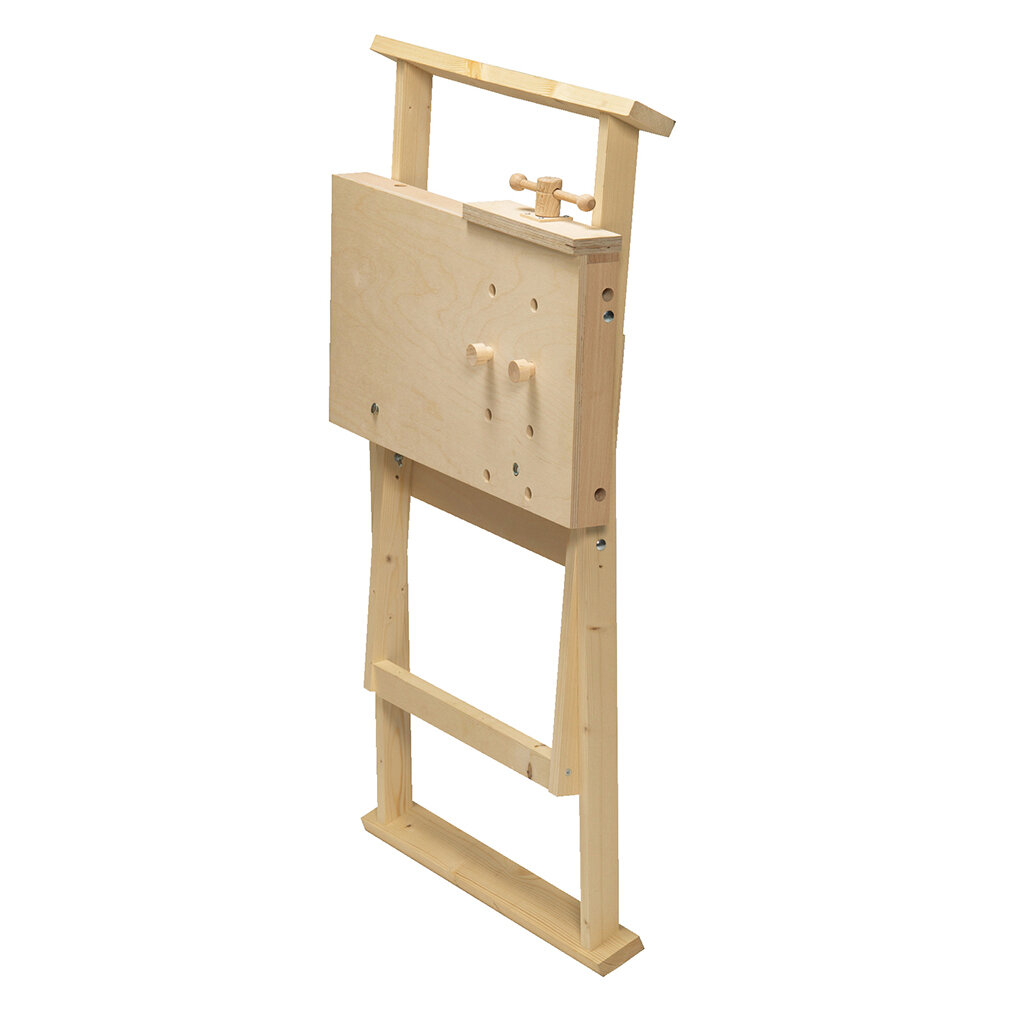 | Дополнительная информация | Размер рабочей поверхности 30 х 75 см, возможна регулировка высоты (до 74 см). Верстак изготовлен из натурального дерева. |