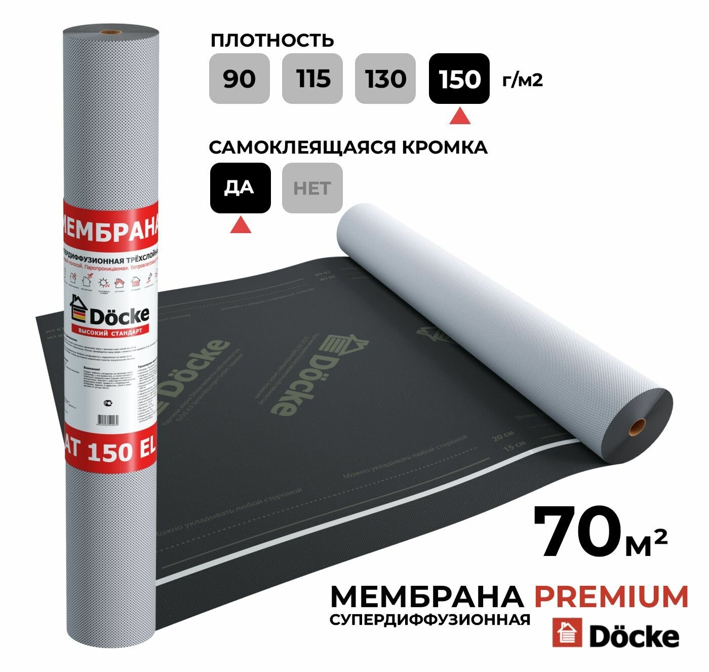 Супердиффузионная мембрана DOCKE АT 150 EL трехслойная, универсальная, с клеевой полосой, 70 кв.м ZMAN-1099 информация: