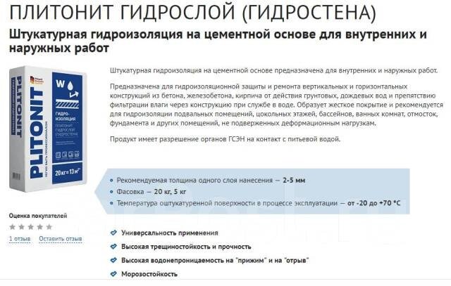 | Дополнительная информация | Гидроизоляция ПЛИТОНИТ ГидроСлой жесткая обмазочная цементная 5кг |