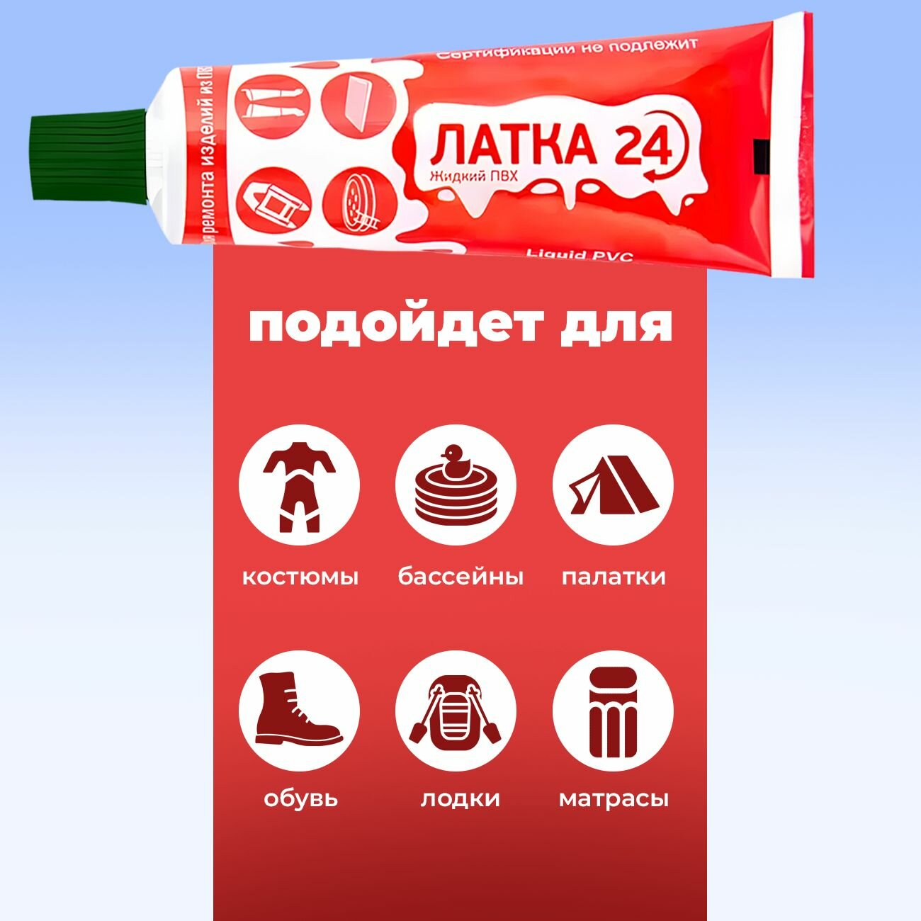 Жидкая Латка 24, заплатка, клей водостойкий 25г для ремонта изделий из ПВХ, лодок, матрасов, бассейнов, цвет красный