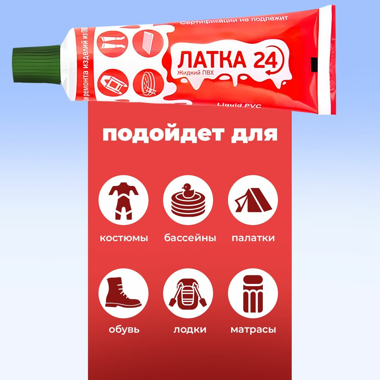 Жидкая Латка 24, заплатка, клей водостойкий 25г для ремонта изделий из ПВХ, лодок, матрасов, бассейнов, цвет красный
