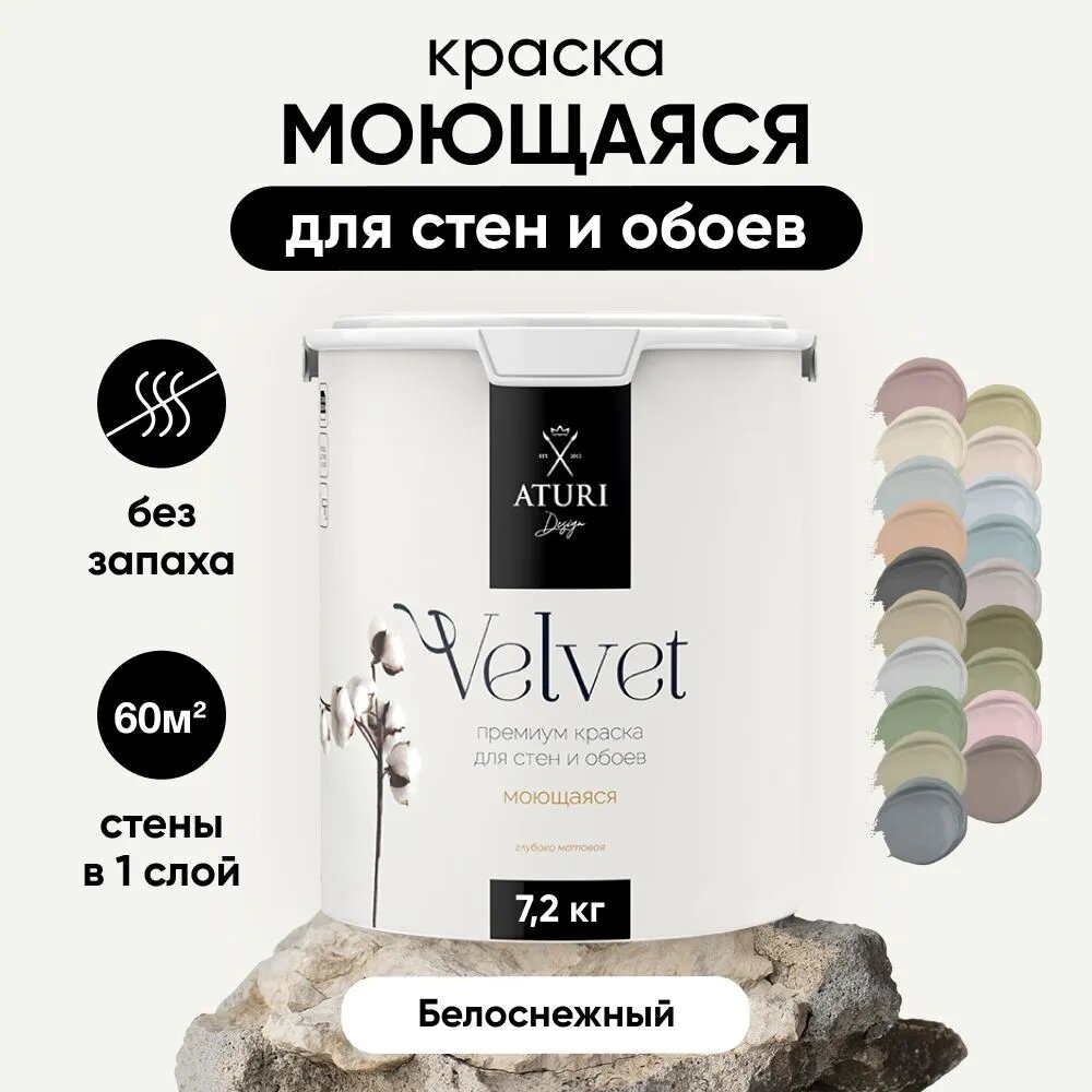 Краска для стен и обоев Aturi Design Velvet Нежный пепел 7 кг, моющаяся, без запаха быстросохнущая, для потолка 7 898 ₽