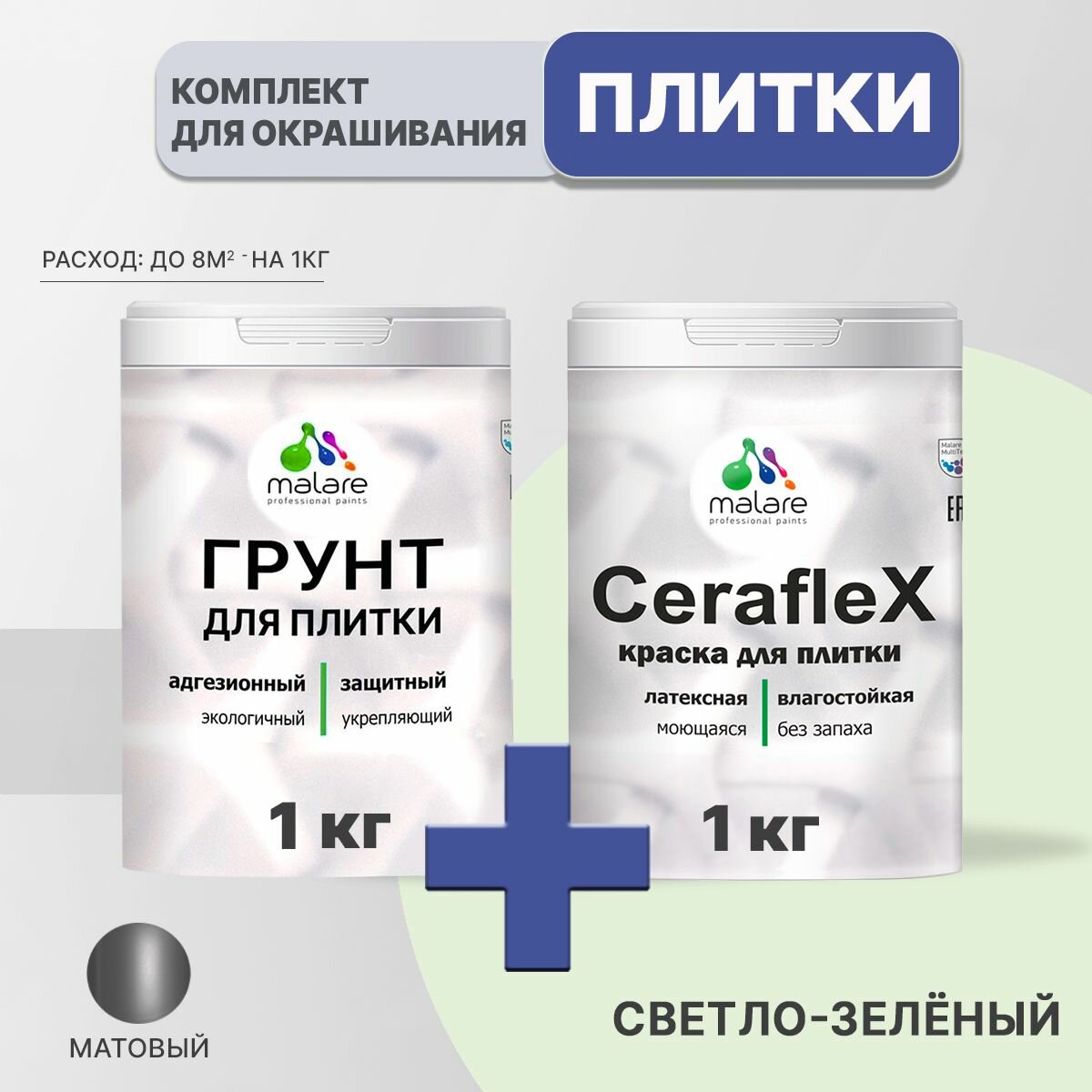 Комплект Malare для окрашивания плитки и кафеля (1кг грунт + 1кг краска), акриловый, без запаха, быстросохнущий, матовый, цвет светло-зеленый информация:
