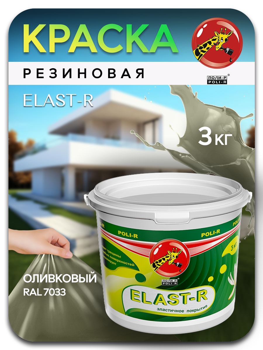 Резиновая Краска Эластичная Polir-R Elast-R 6кг Оливковый RAL 7033 для Ванных Комнат, Влажных Помещений, Потолков, Стен, Заборов, Фасадов, Крыш.