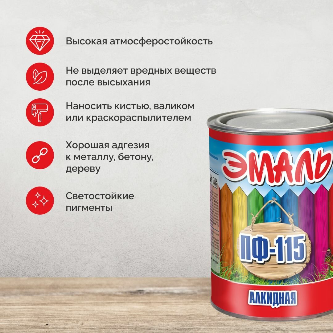 | Дополнительная информация | Универсальная эмаль ПФ-115 предназначена для окраски металлических, деревянных и других поверхностей, подвергающихся атмосферным воздействиям, и для окраски внутри помещений (кроме окраски пола). |