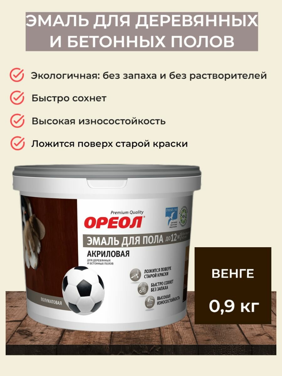 Эмаль для пола Ореол акриловая быстросохнущая Венге полуматовая 0,9кг информация: