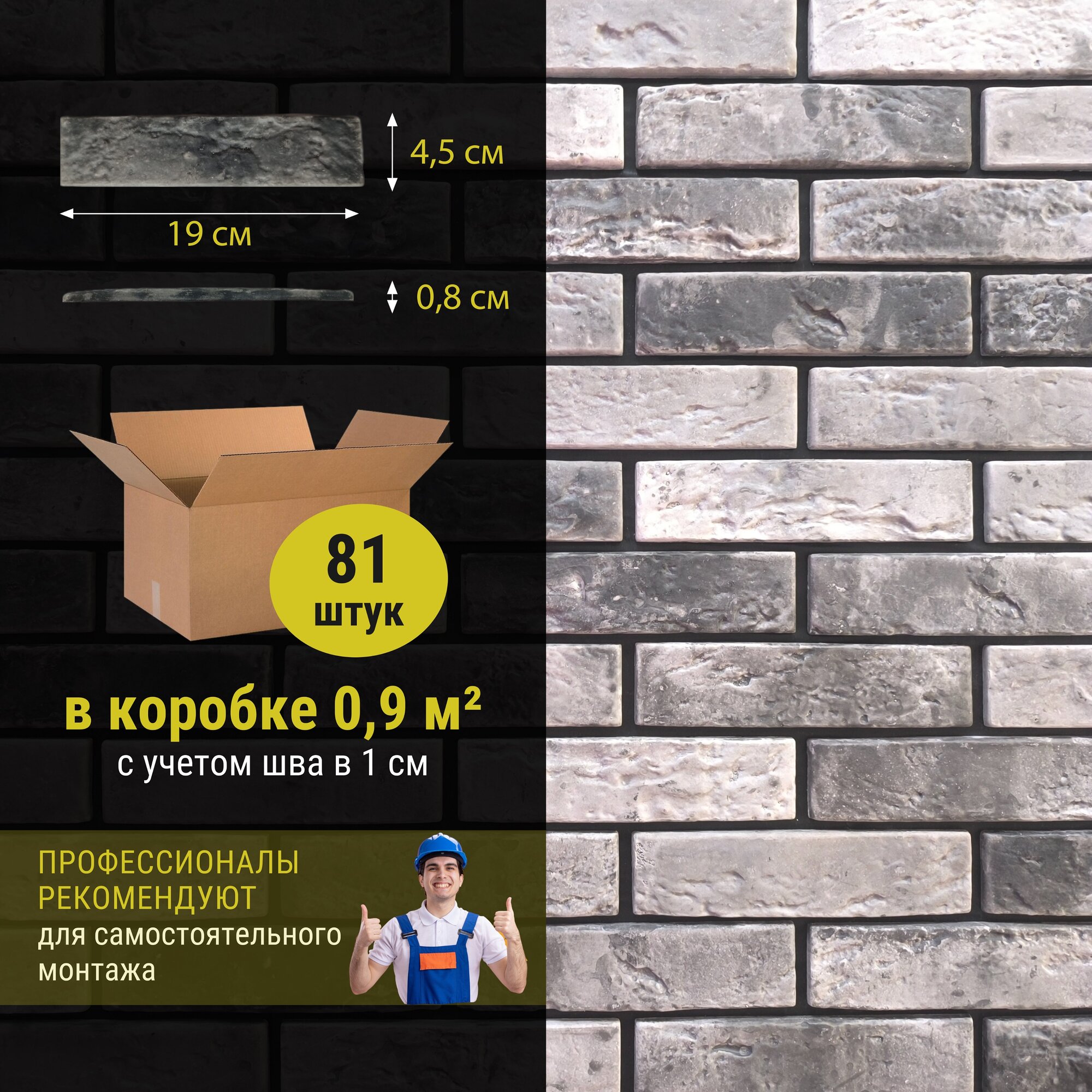 Декоративный гипсовый кирпич камень плитка 190х45х8 - 81 шт, в упаковке 0,9 м2 информация: