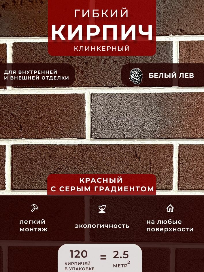 Гибкий клинкерный кирпич "Красный с серым градиентом". Декоративный кирпич. Для внутренней и внешней отделки информация: