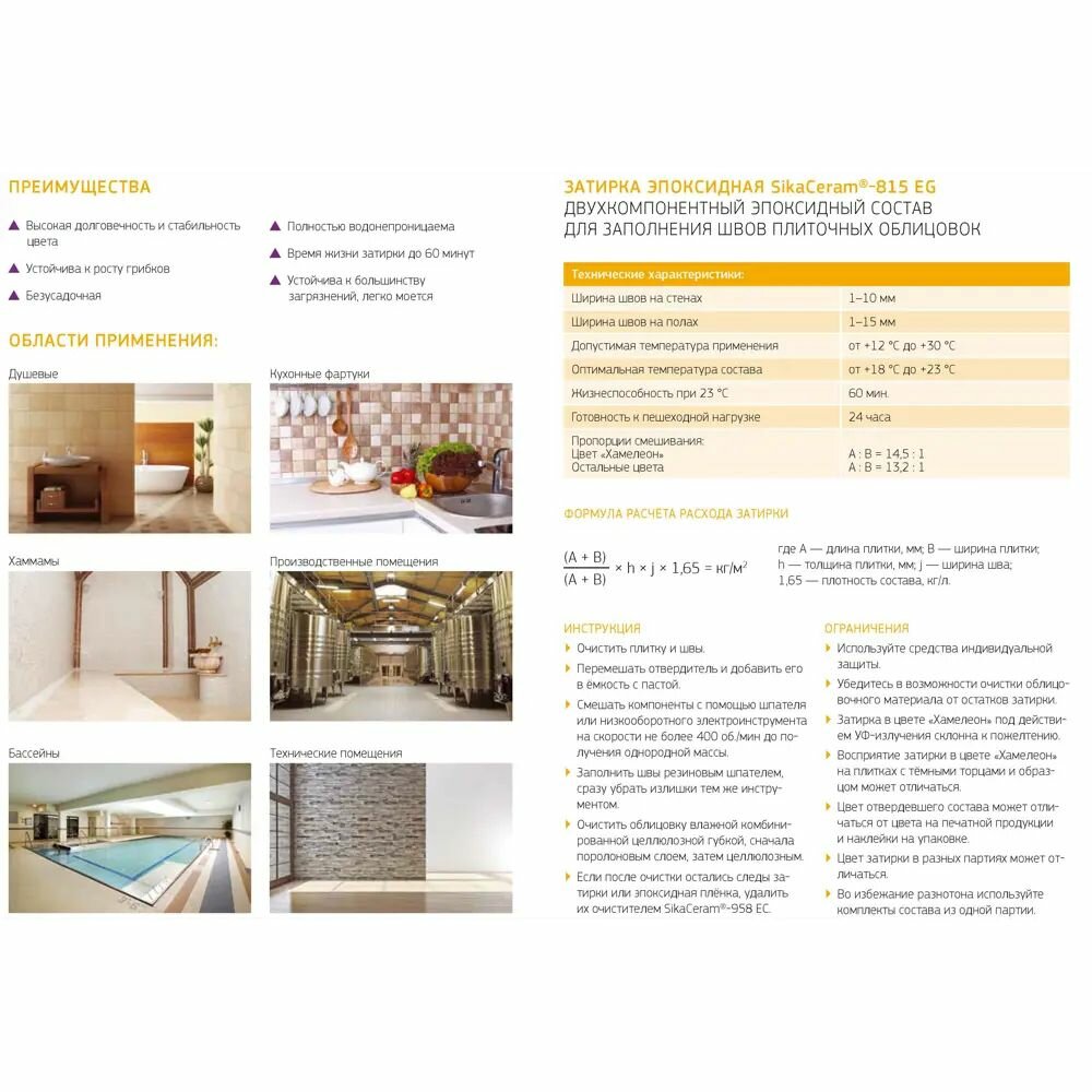 | Область применения | бассейны, для ванной комнаты, для внутренних работ, для герметизации угловых швов и стыков, для затирки швов, для кухни, для наружных работ, для пола, для производственных помещений, для стен, для теплого пола, керамическая плитка, керамогранит, мозаика, натуральный камень |