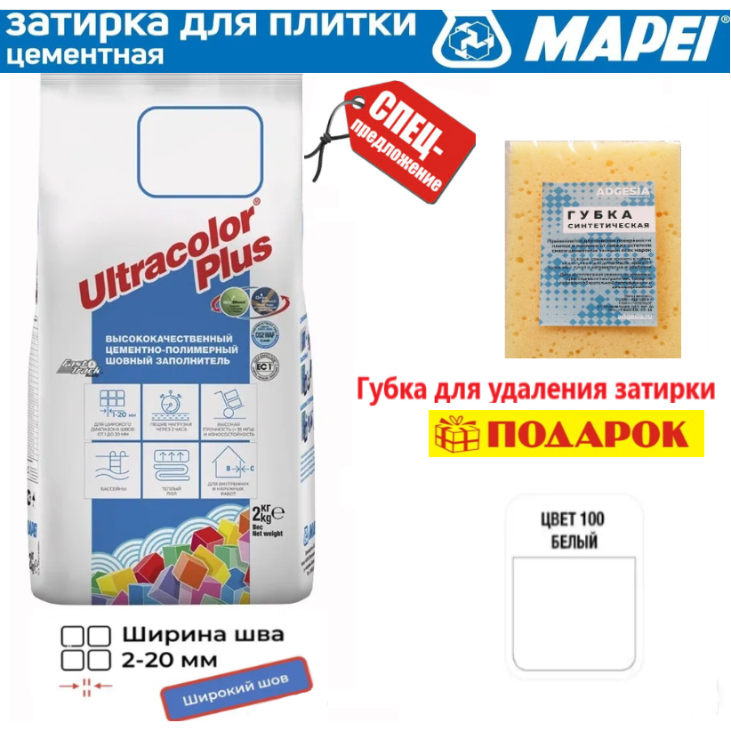 10 цен на Цементная затирка MAPEI Ultracolor Plus №100 белый (2 кг)+ губка в подарок!