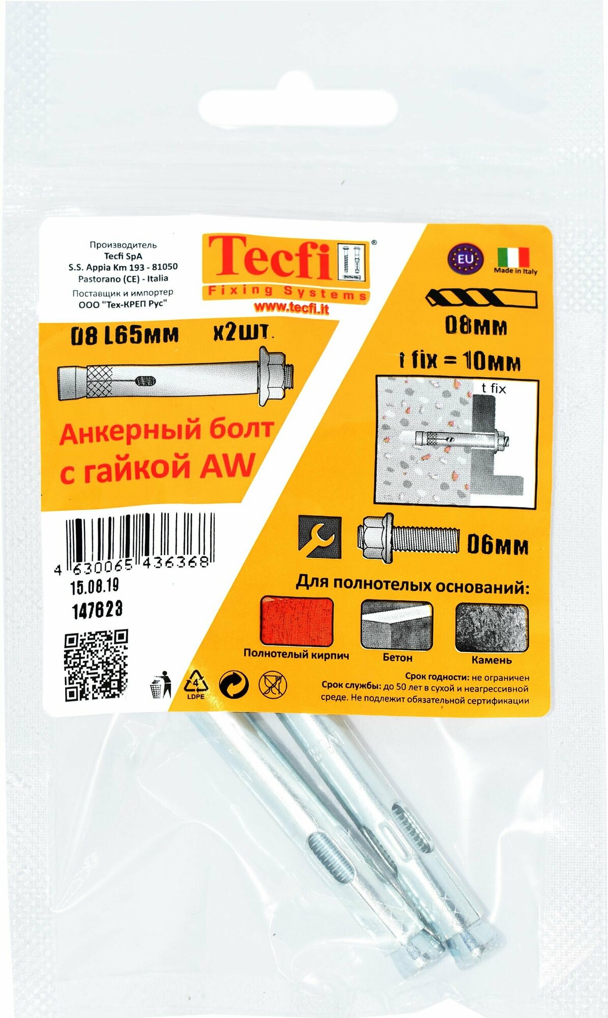 | Комплектация | Анкерный болт с гайкой Tecfi AW ZN 8x65/10 2 шт |