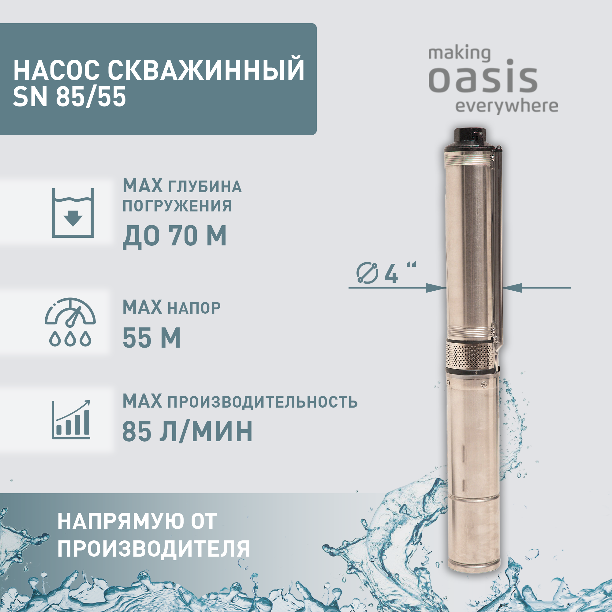 Насос погружной скважинный для воды Oasis SN 85/55, водяной для колодца, для перекачки информация: