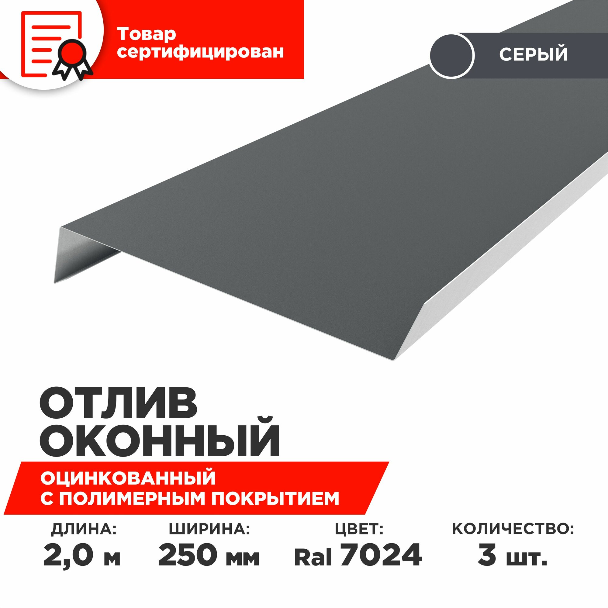 Отлив оконный ширина полки 250мм/ отлив для окна / цвет серый(RAL 7024) Длина 2м, 3 штуки в комплекте информация:
