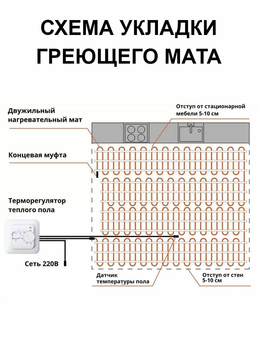 Теплый пол электрический под плитку Ридан TF-150 0,5 м2 нагревательный мат тонкий на самоклеящейся сетке