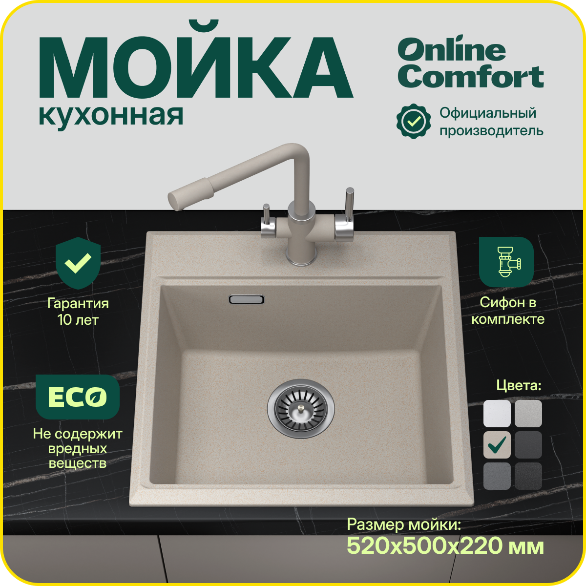 10 цен на Врезная кухонная мойка Comfort 52х50 см, кварцевая, квадратная, цвет Пирит, модель 5202